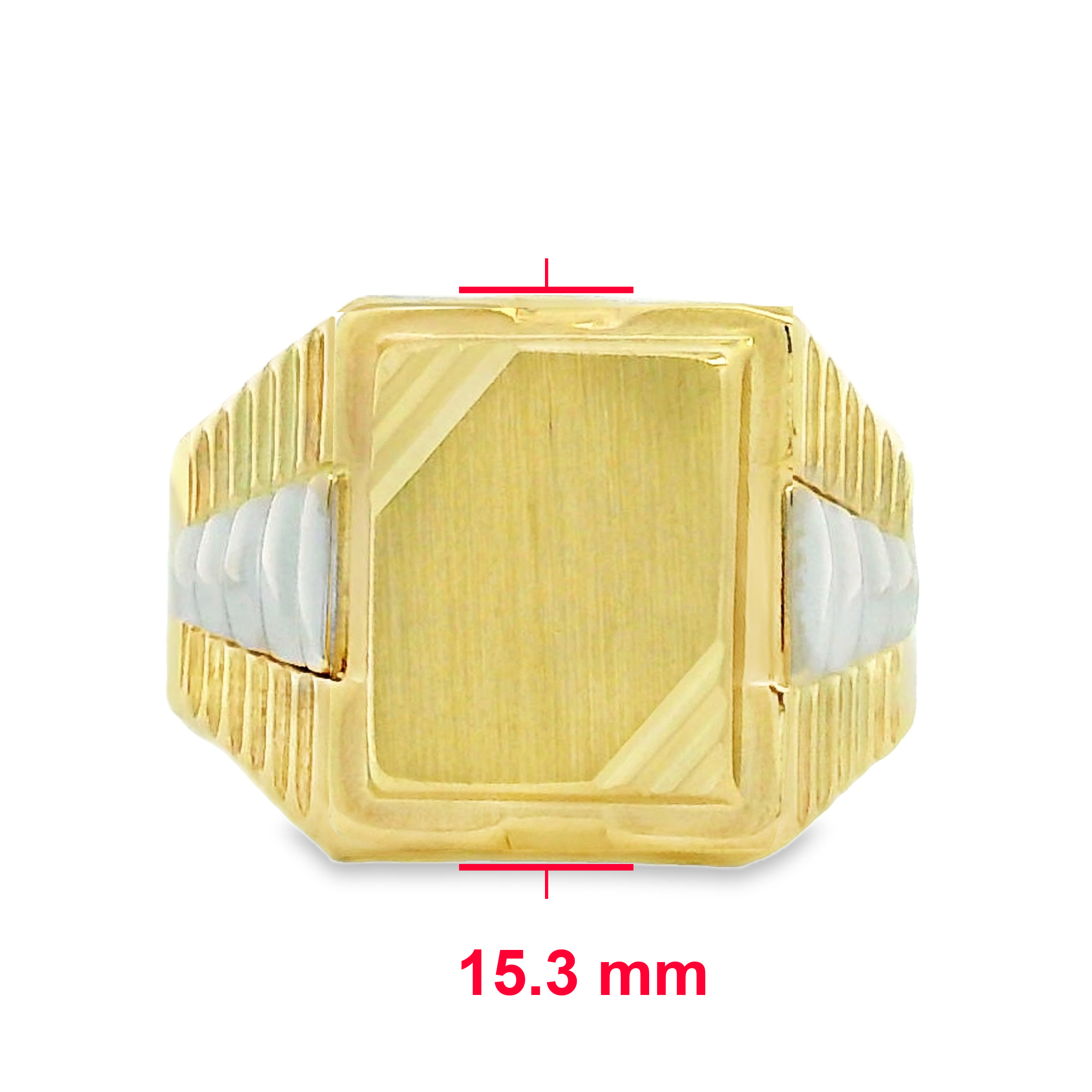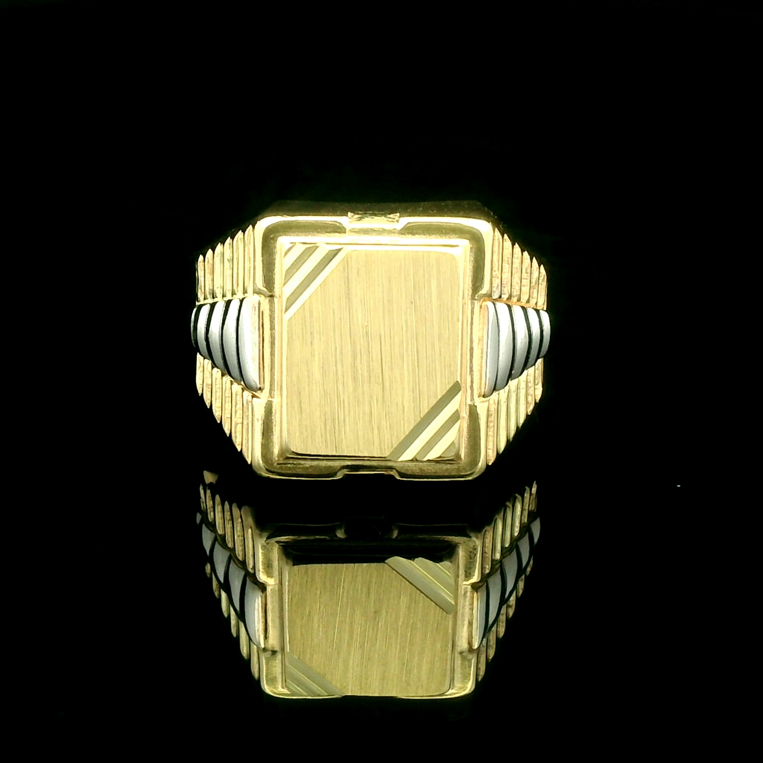 Deze moderne 14 karaat bicolor zegelring is een stijlvol statement voor de zelfbewuste man. Het strakke, geometrische design met matte afwerking en glanzende accenten geeft de ring een krachtige, eigentijdse uitstraling. De combinatie van geel- en witgoud zorgt voor een subtiel contrast dat direct in het oog springt.