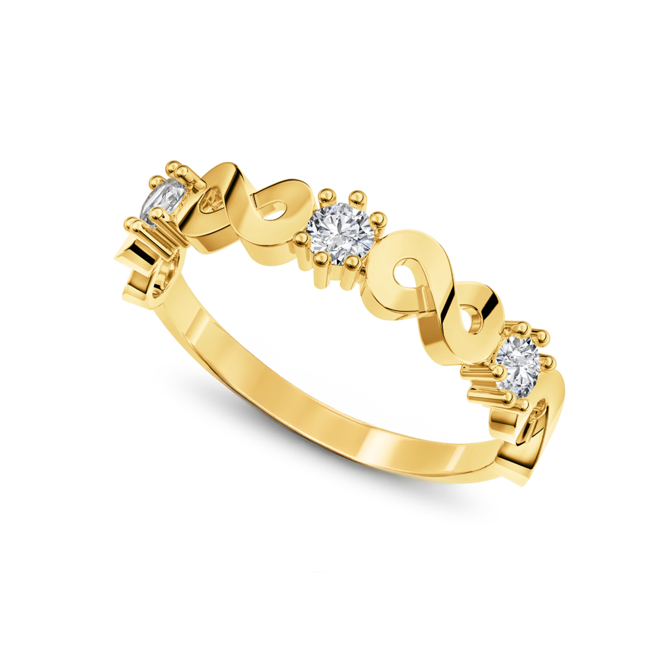 Deze elegante 14 karaat gouden ring straalt pure verfijning uit. Het tijdloze ontwerp is gezet met een schitterende centrale zirkonia, geflankeerd door twee kleinere stenen die samen een betoverend lichtspel creëren. De subtiele details op de band geven de ring een speelse en luxe uitstraling. Perfect als romantisch cadeau of als stijlvolle toevoeging aan je sieradencollectie.