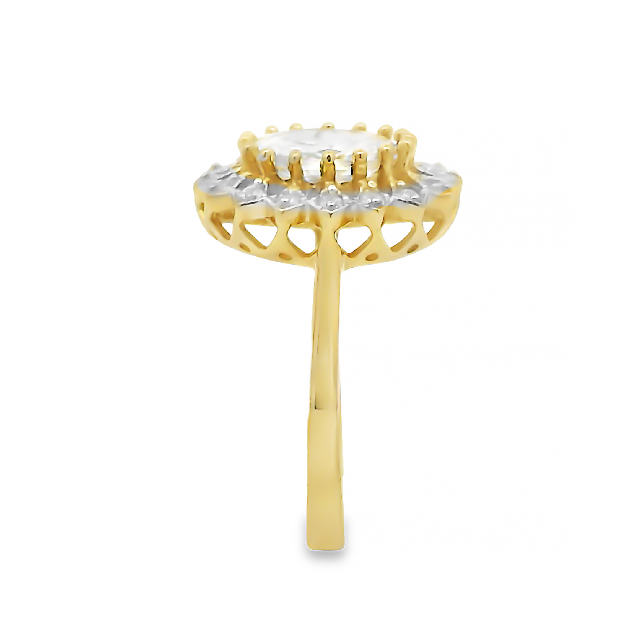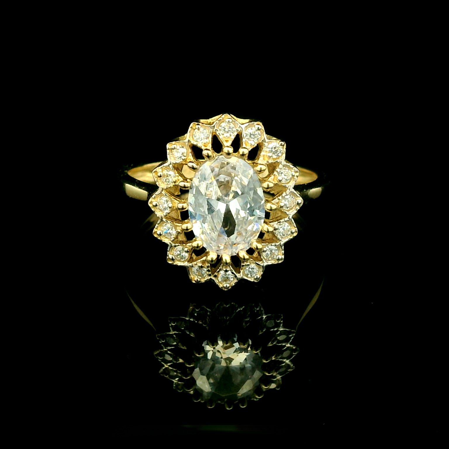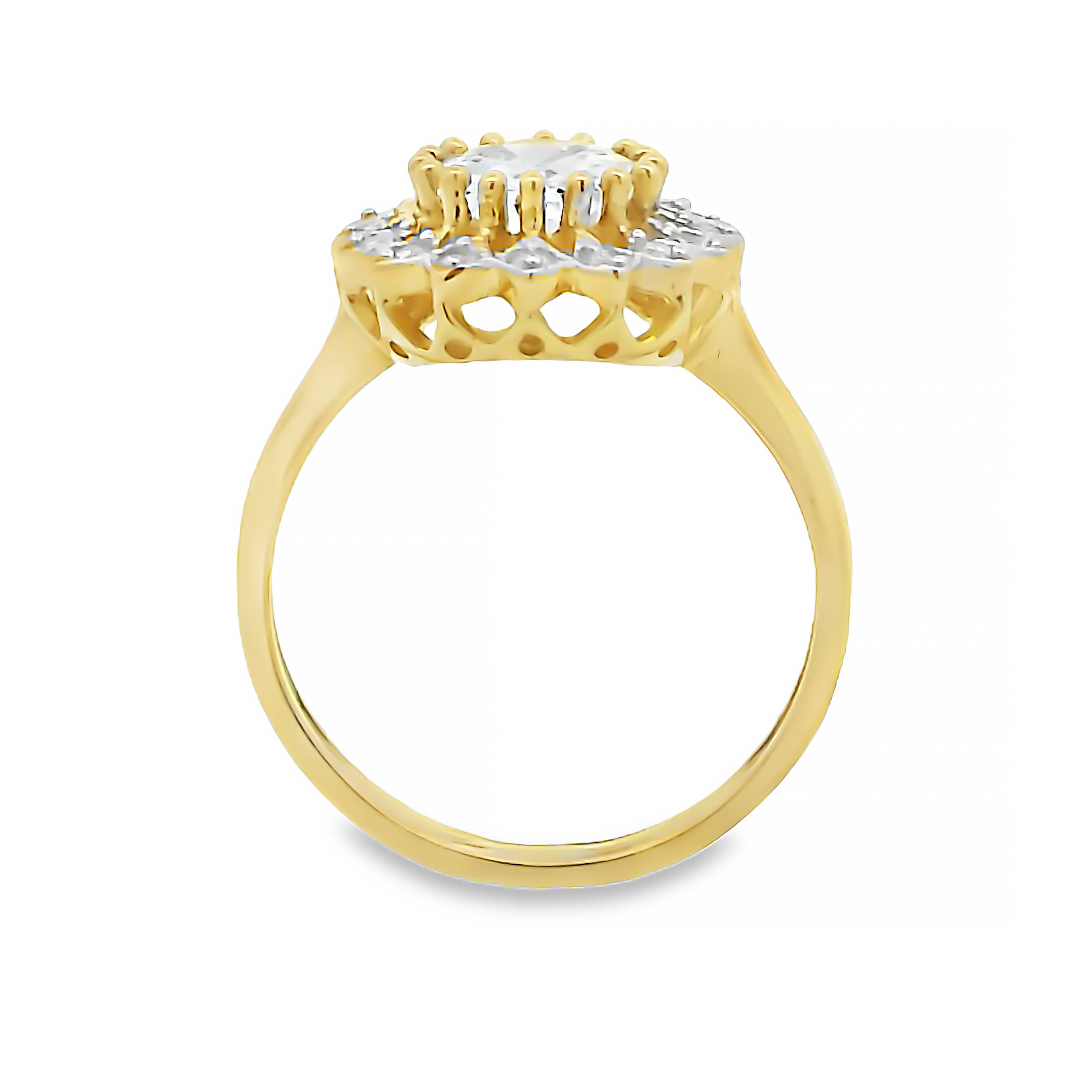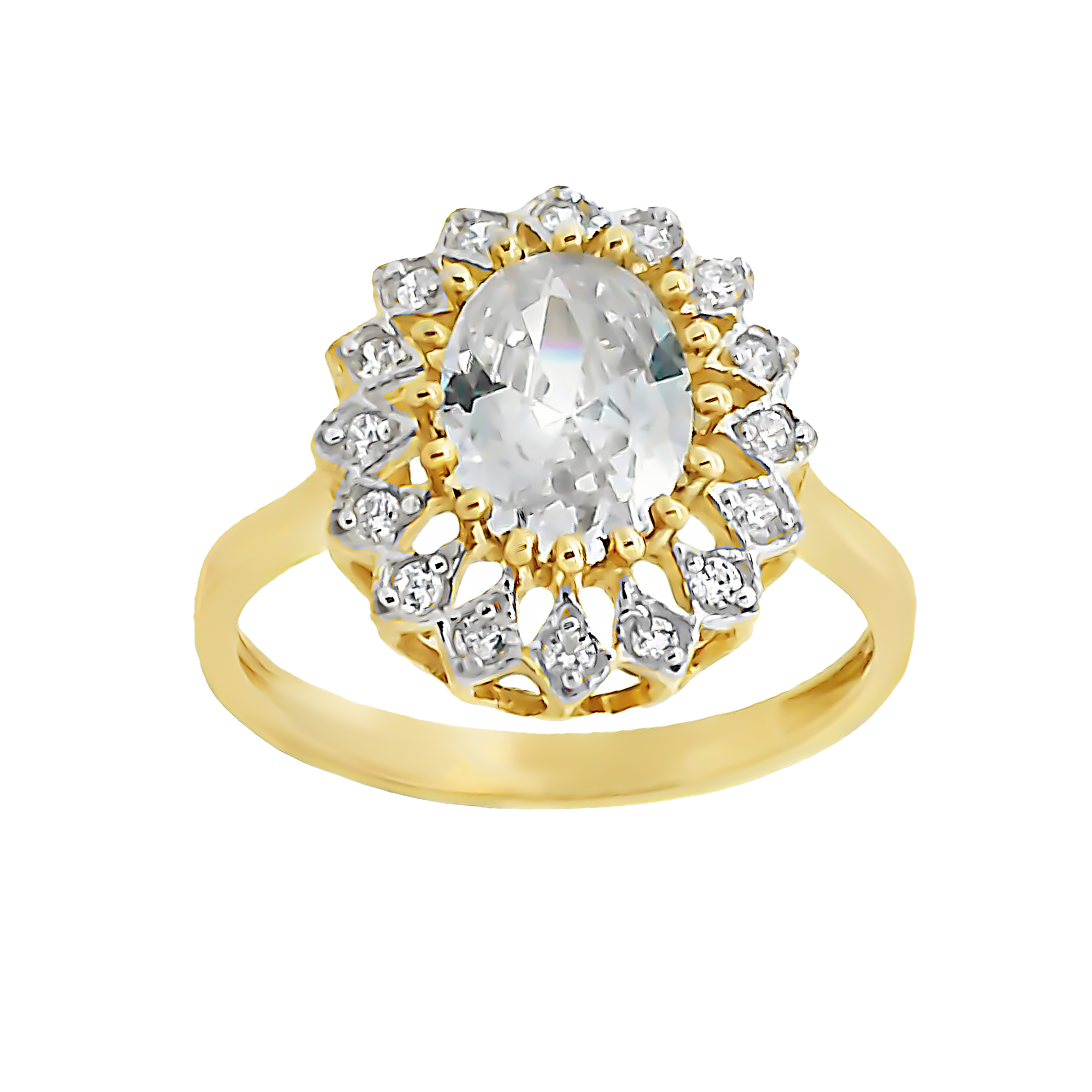 Deze elegante 14 karaat gouden damesring straalt luxe en verfijning uit. De ring is voorzien van een grote, ovaal geslepen transparante zirkonia in het midden, omringd door een schitterende krans van kleinere zirkonia steentjes. De opengewerkte zetting geeft het ontwerp een luchtige en sierlijke uitstraling. Dankzij de klassieke vorm is deze ring perfect voor zowel feestelijke gelegenheden als dagelijkse elegantie. Een tijdloos sieraad met een vrouwelijke touch.
