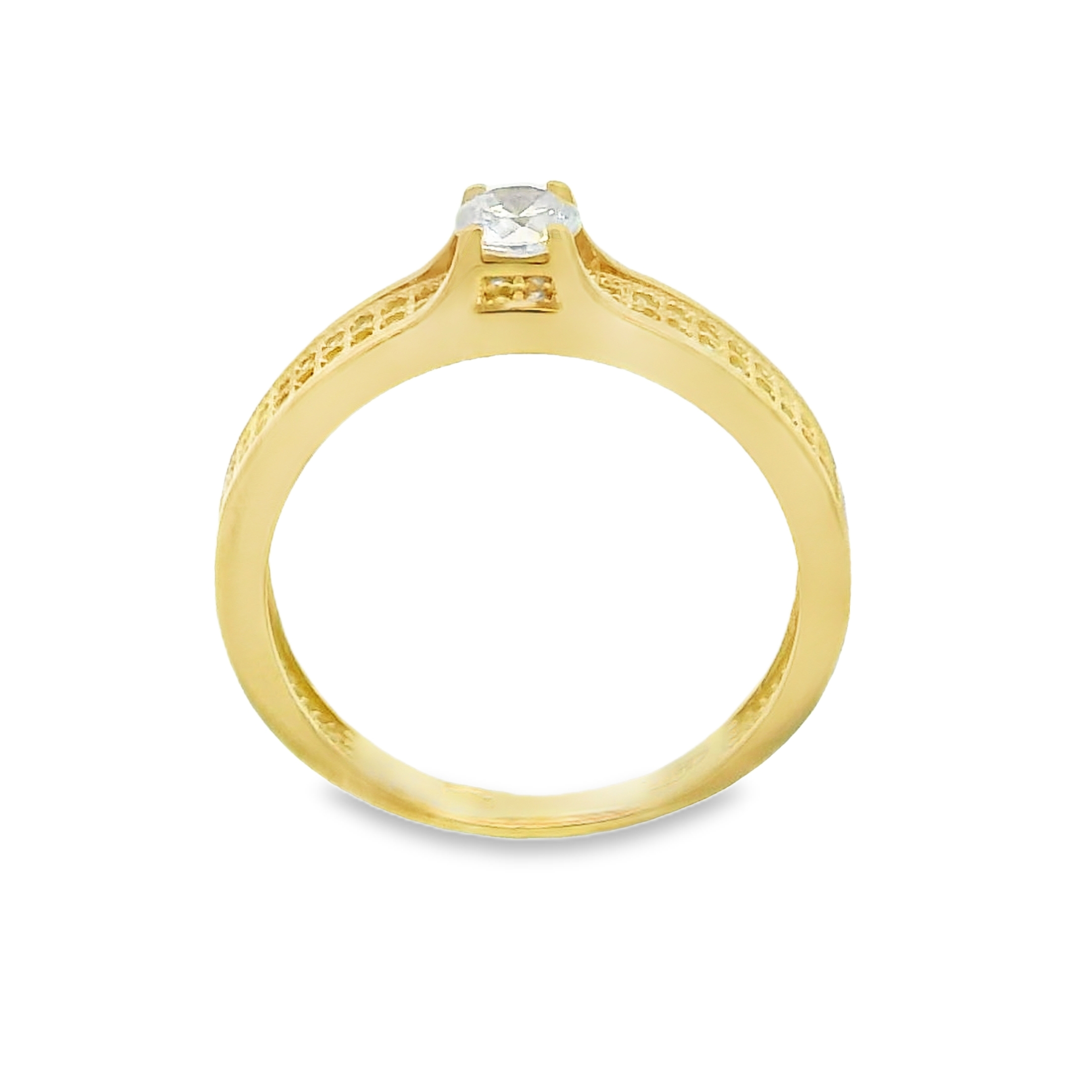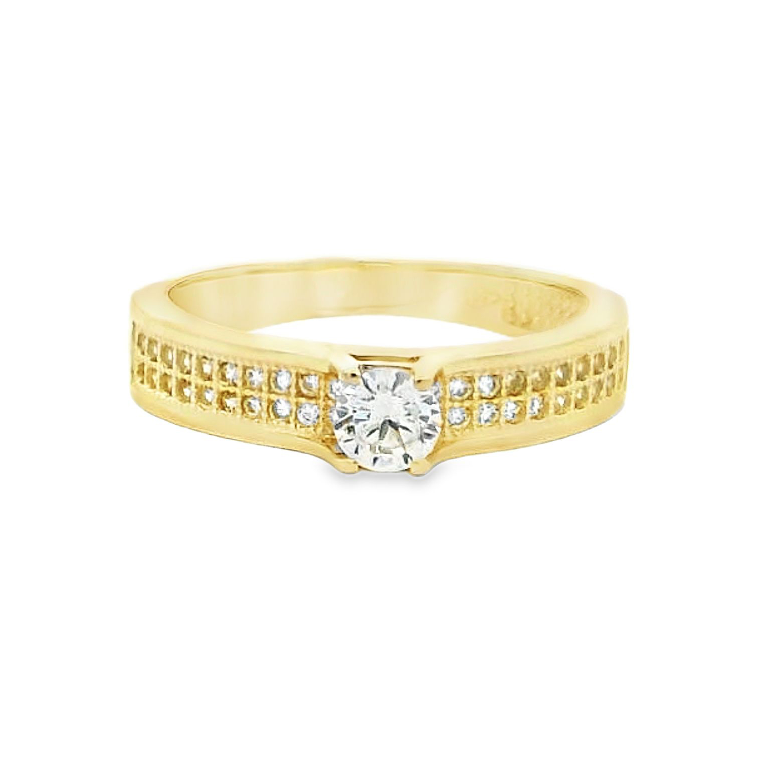 Deze 14 karaat gouden ring straalt luxe uit met zijn schitterende centrale zirkonia. De band is aan beide zijden bezet met een dubbele rij kleinere zirkonia’s, wat zorgt voor een sprankelende en elegante uitstraling. Het klassieke ontwerp met moderne details maakt deze ring perfect voor zowel dagelijks gebruik als speciale gelegenheden. Een tijdloos sieraad dat stijl en glamour combineert.