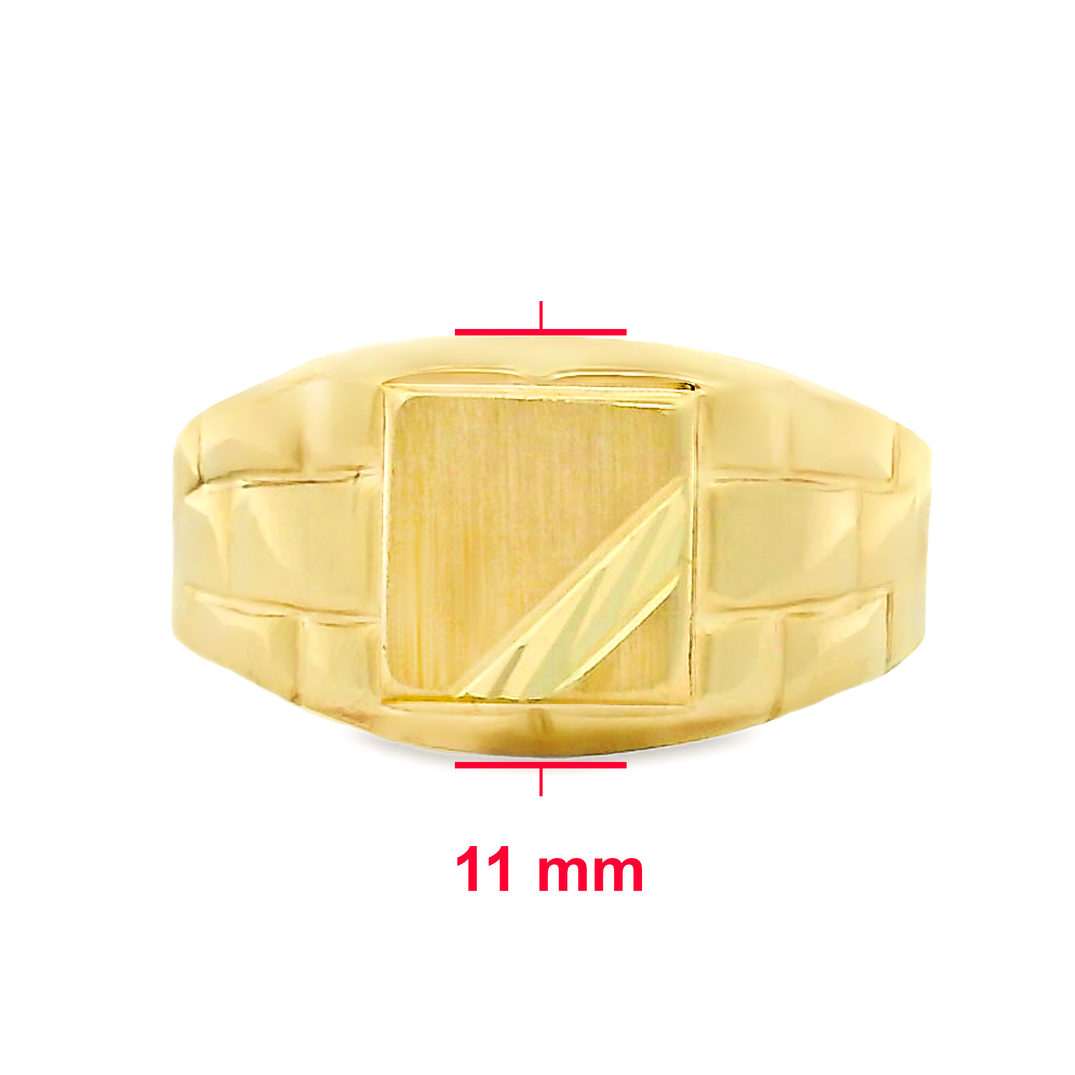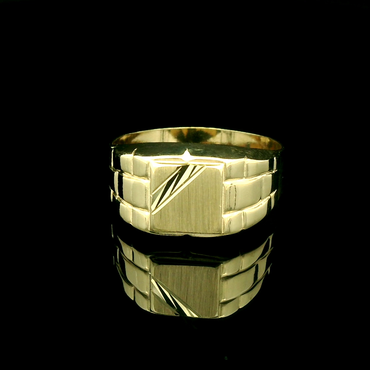 Deze 14 karaat gouden heren zegelring heeft een strakke en stijlvolle uitstraling. Het vierkante vlak is voorzien van twee diagonale lijnaccenten die het ontwerp een moderne touch geven. De brede band heeft een bewerkt patroon dat zorgt voor een stoere en unieke look. Een tijdloos sieraad dat klasse en karakter uitstraalt. Perfect om dagelijks te dragen of cadeau te doen.