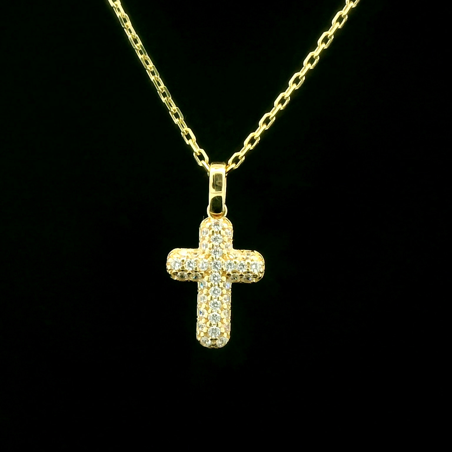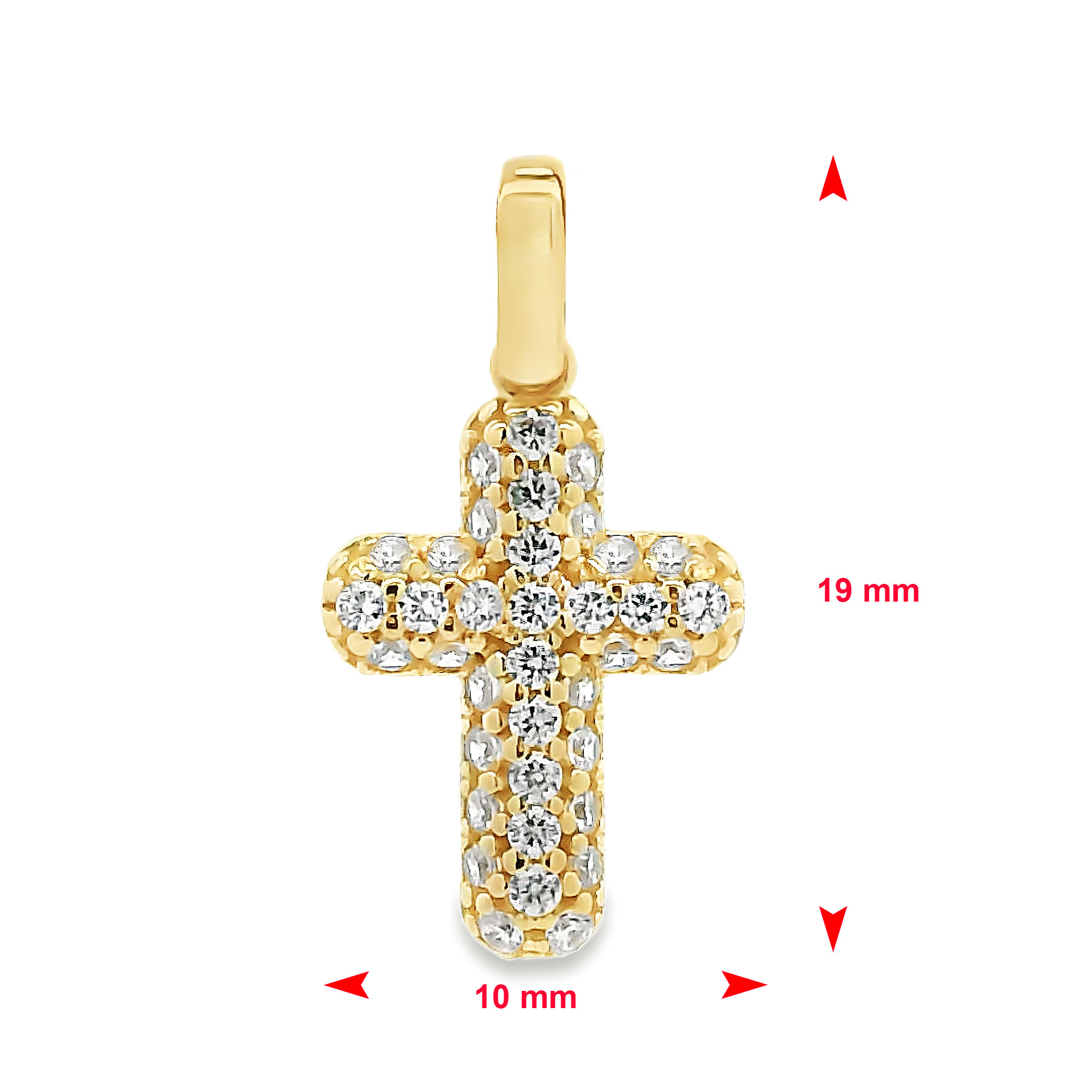 Deze 14 karaat geelgouden hanger in de vorm van een klassiek kruis is rijkelijk bezet met zirkonia stenen in pavézetting. De afgeronde randen en glanzende afwerking geven het ontwerp een luxe uitstraling. Een opvallend sieraad dat elegantie en symboliek moeiteloos combineert.