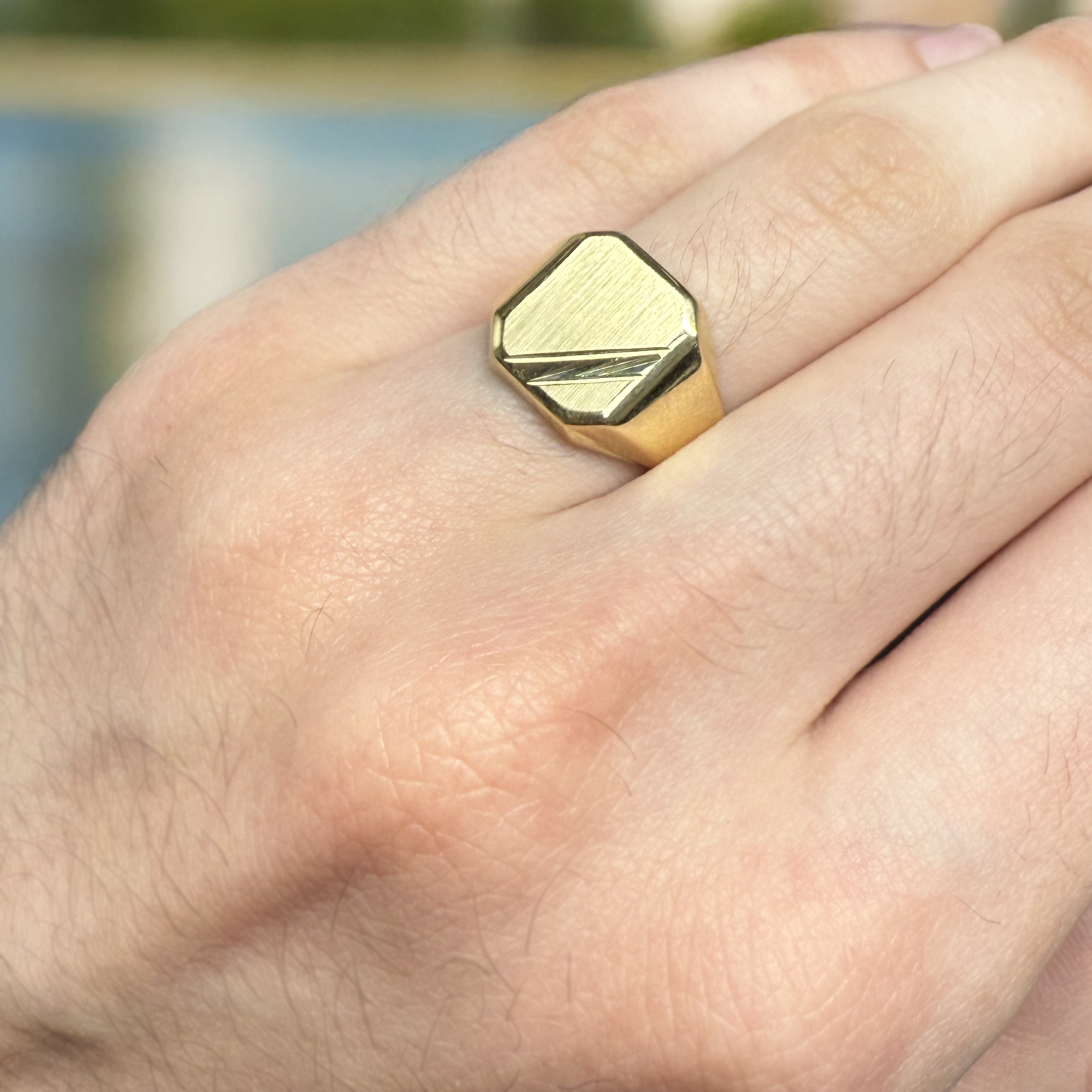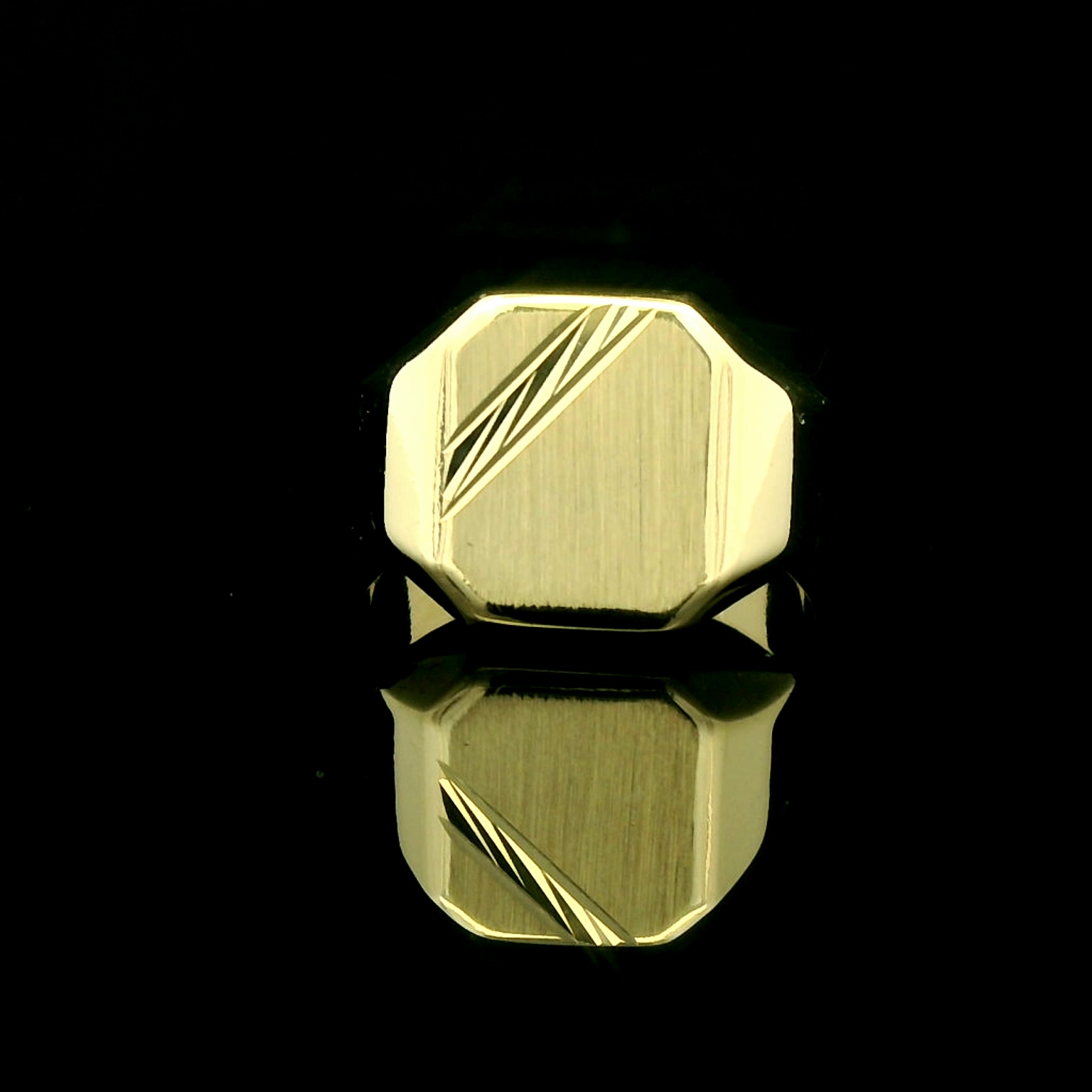 Deze 14 karaat gouden zegelring heeft een moderne en strakke uitstraling. Het vlakke oppervlak wordt stijlvol onderbroken door een subtiel geometrisch reliëf. De ring is tijdloos en past bij zowel formele als alledaagse gelegenheden. Een krachtig statement zonder overdaad.