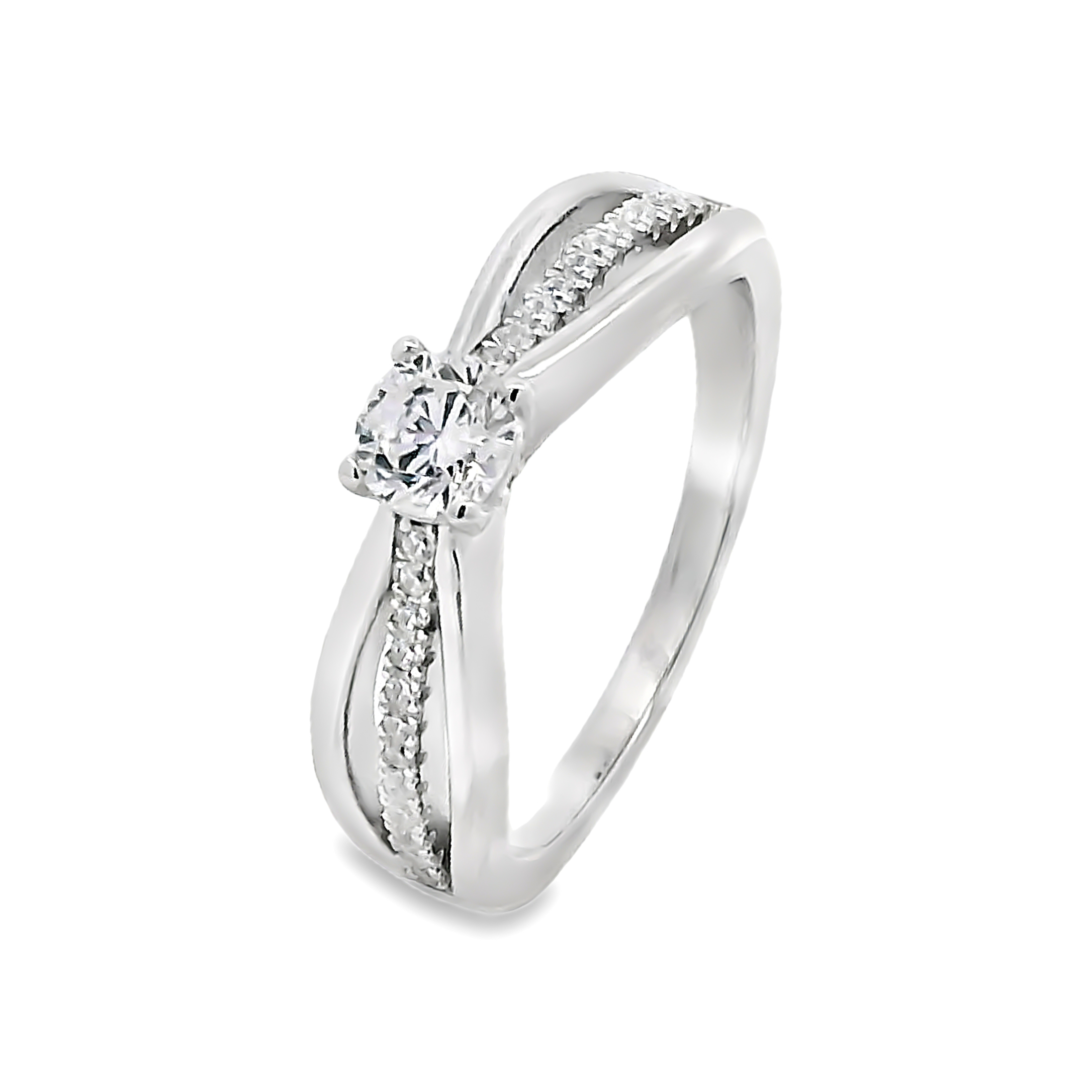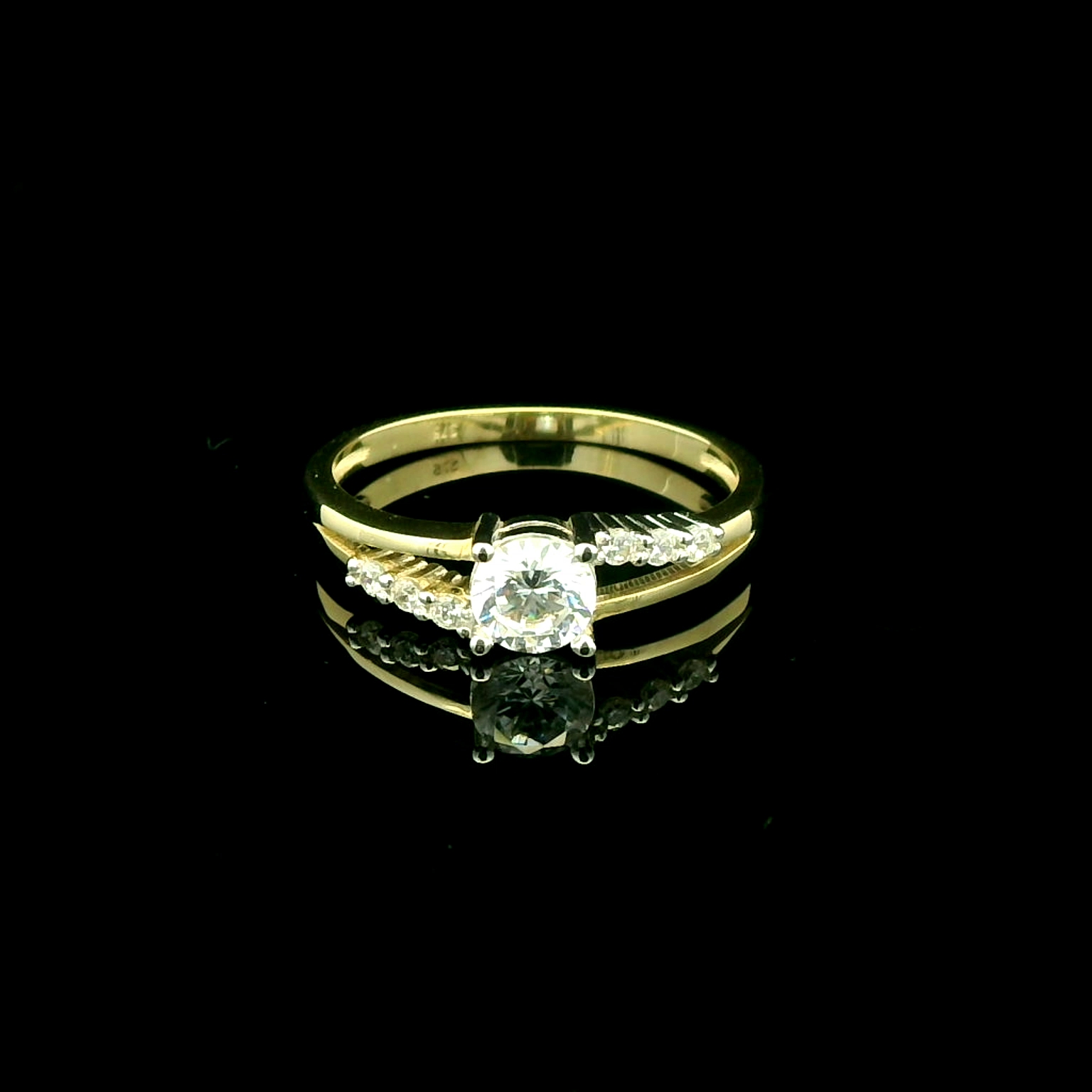 Deze verfijnde 9 karaat ring is bezet met een schitterende ronde zirkonia als middelpunt. Aan beide kanten van de steen lopen kleinere zirkonia’s elegant mee over de band. De combinatie van glans en symmetrie geeft de ring een klassieke en tijdloze uitstraling. De band heeft een subtiele vorm die mooi aansluit op de vinger. Perfect als stijlvol cadeau of als elegante aanvulling op je eigen collectie.