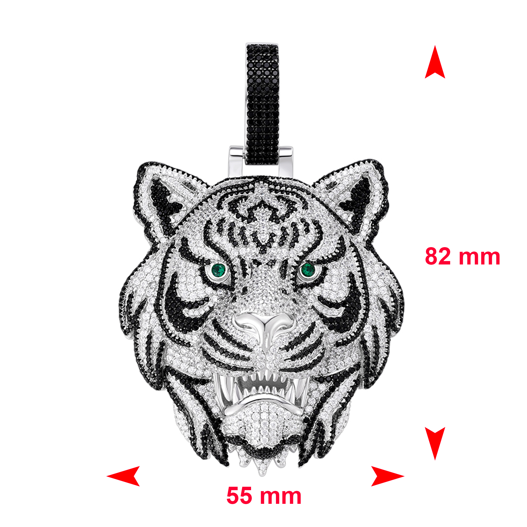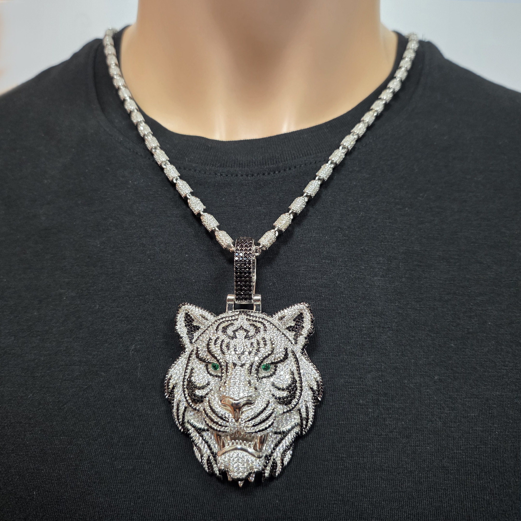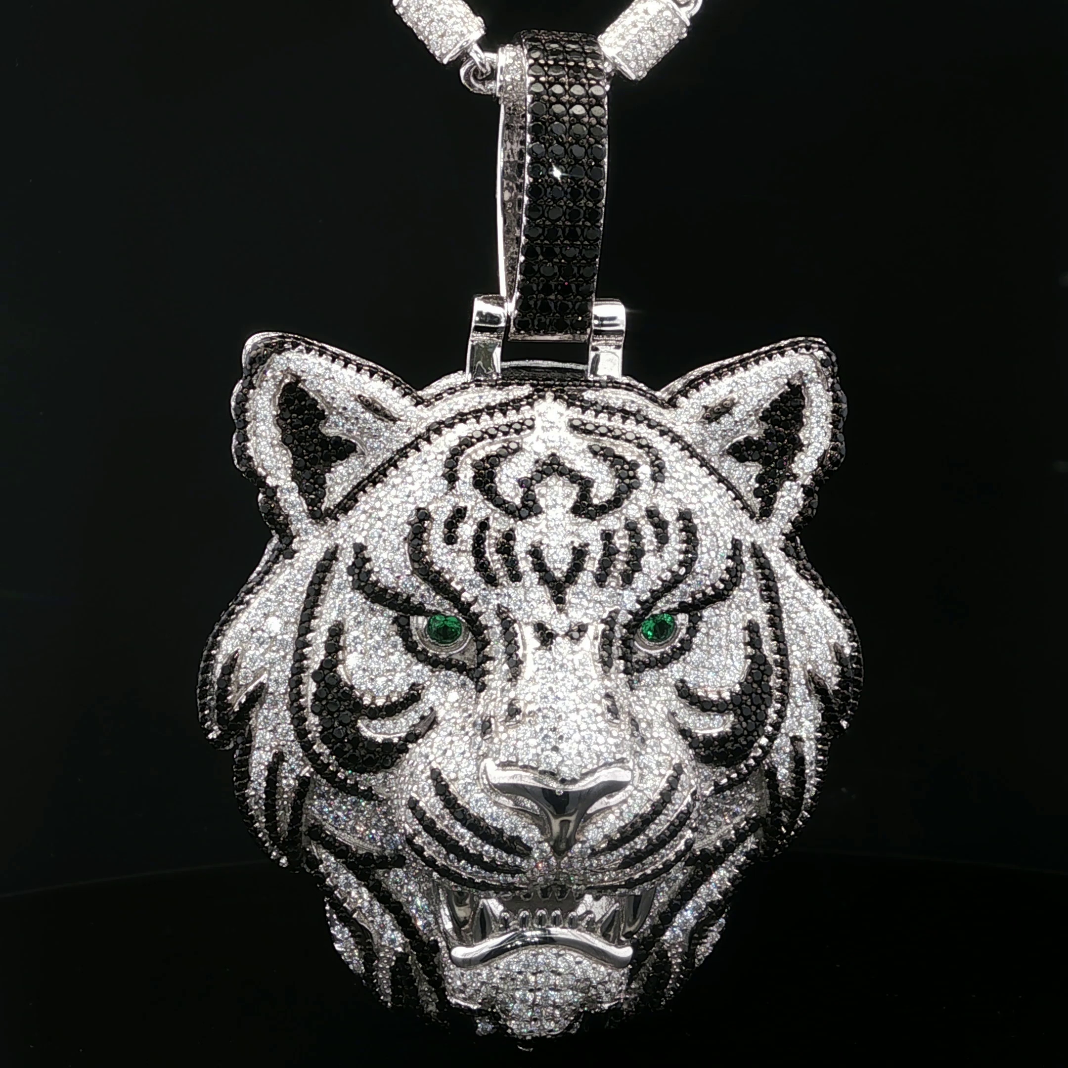 Zilveren gerhodineerde tijgerhanger, volledig gezet met zwarte, witte en groene zirkonia. De combinatie van contrasterende kleuren en scherpe details geeft deze hanger een stoere, luxe uitstraling. Een echte eyecatcher die kracht en stijl perfect in balans brengt.