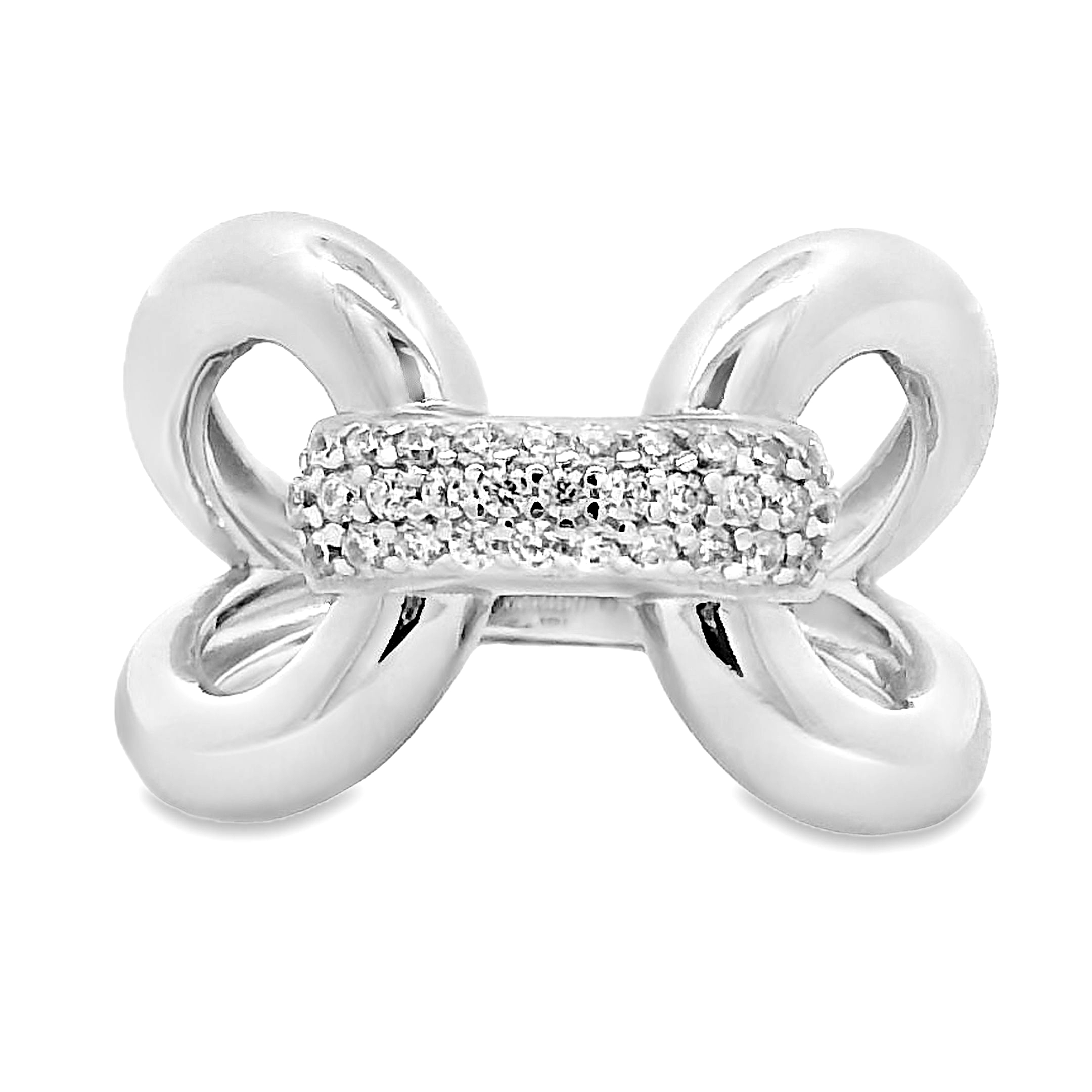 Deze bijzondere ring combineert vloeiende vormen met een luxe afwerking. Twee elegante, lusvormige elementen worden verbonden door een middenstuk dat rijkelijk is bezet met fonkelende zirkonia’s. Het speelse, open ontwerp geeft de ring een moderne en artistieke uitstraling. Perfect voor wie houdt van een opvallend sieraad met een uniek karakter. Een echte eyecatcher die zowel solo als in combinatie gedragen kan worden.