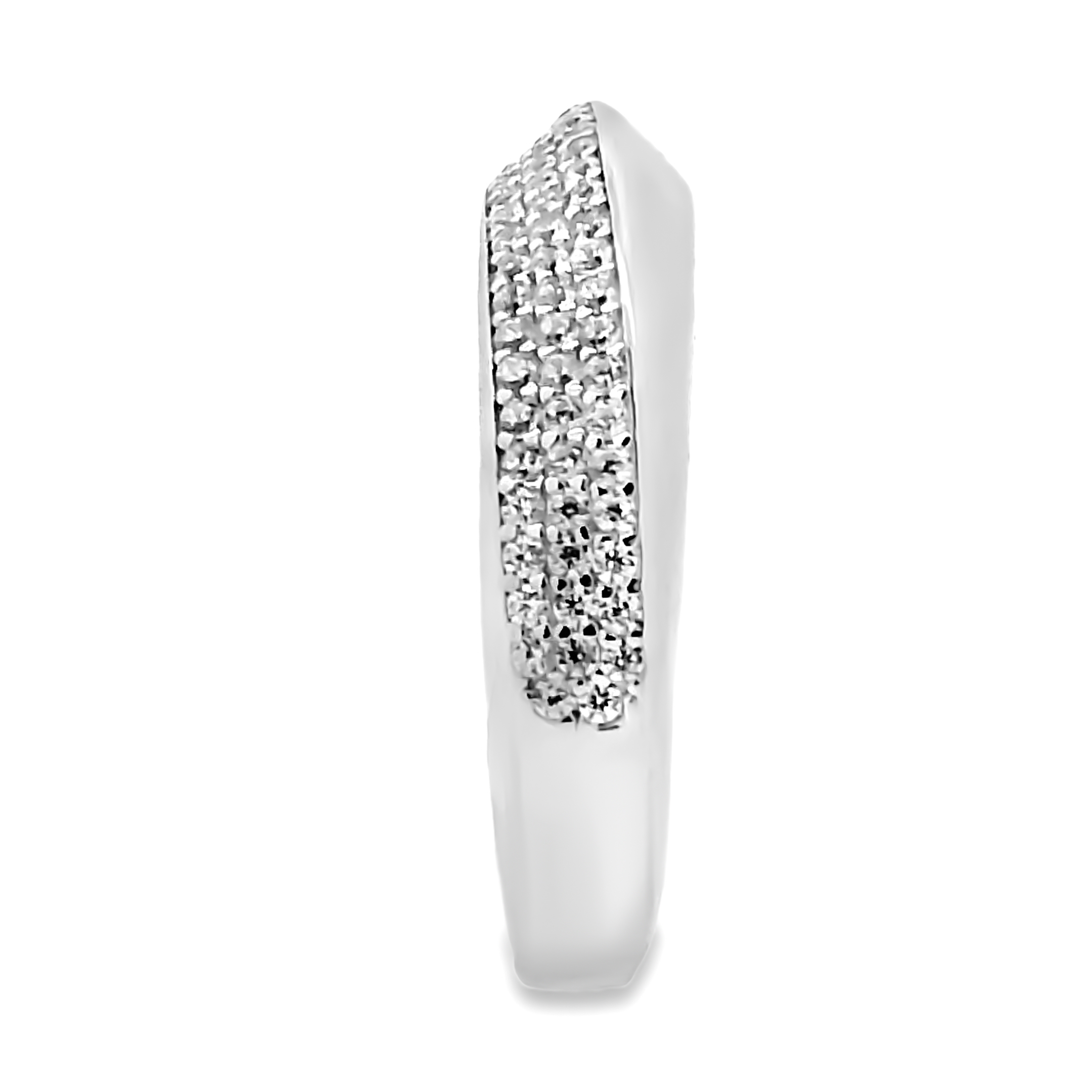 Zilveren gerhodineerde ring met een stijlvolle en moderne uitstraling. De band heeft een elegante golfvorm die subtiel is gezet met meerdere rijen sprankelende zirkonia stenen. Dit zorgt voor een verfijnd contrast tussen het glanzende zilver en de fonkeling van de stenen. Het strakke design maakt de ring veelzijdig en geschikt voor zowel dagelijks gebruik als feestelijke gelegenheden.