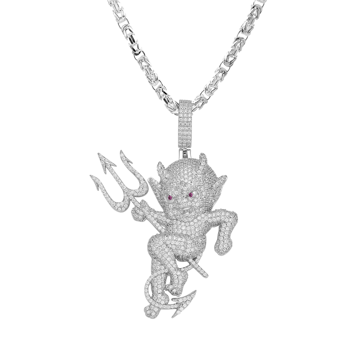 Deze opvallende zilveren hanger in de vorm van een duivelsfiguur is volledig gezet met fonkelende zirkonia stenen. Het speelse ontwerp wordt versterkt door de paarse ogen, die direct de aandacht trekken en het karakter een brutale uitstraling geven. De hanger is rijk gedetailleerd, van de scherpe drietand tot de krullende staart. Een uniek statement piece dat zeker een gespreksonderwerp zal zijn.