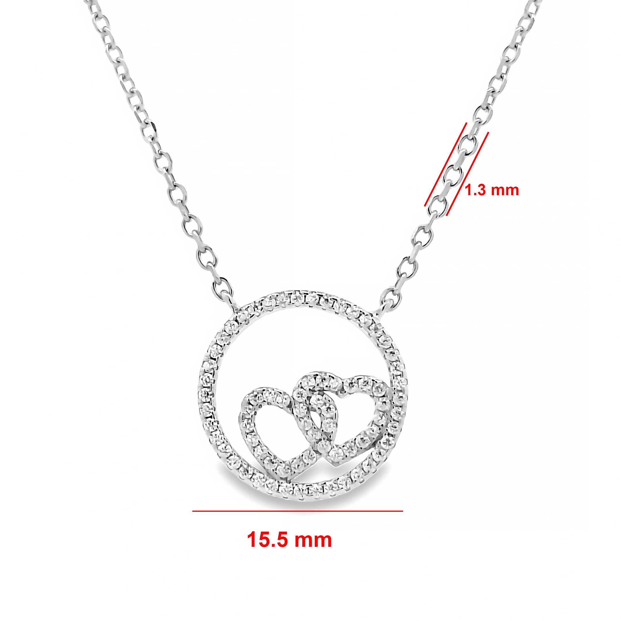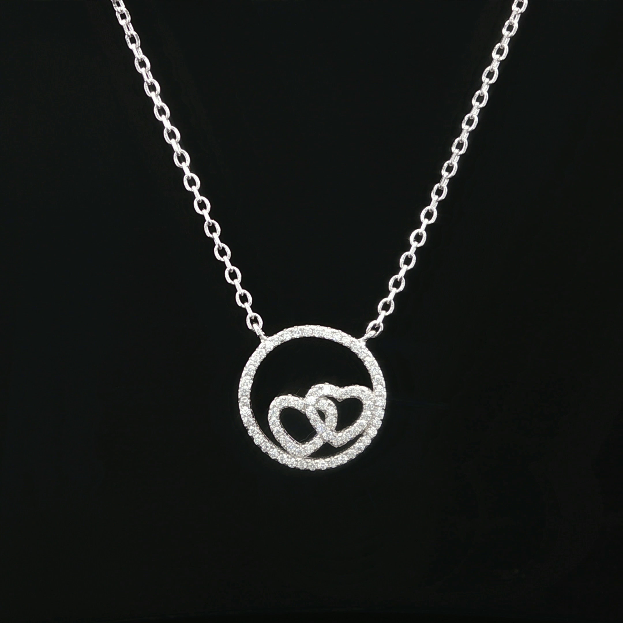 Deze zilveren gerhodineerde ketting is voorzien van een ronde hanger met twee in elkaar verweven harten. De hanger is volledig bezet met zirkonia stenen, wat zorgt voor een verfijnde en elegante uitstraling. Het cirkelvormige ontwerp geeft het sieraad een tijdloos karakter. De harten in het midden symboliseren verbondenheid en liefde. Mooi om solo te dragen of te combineren met andere sieraden.