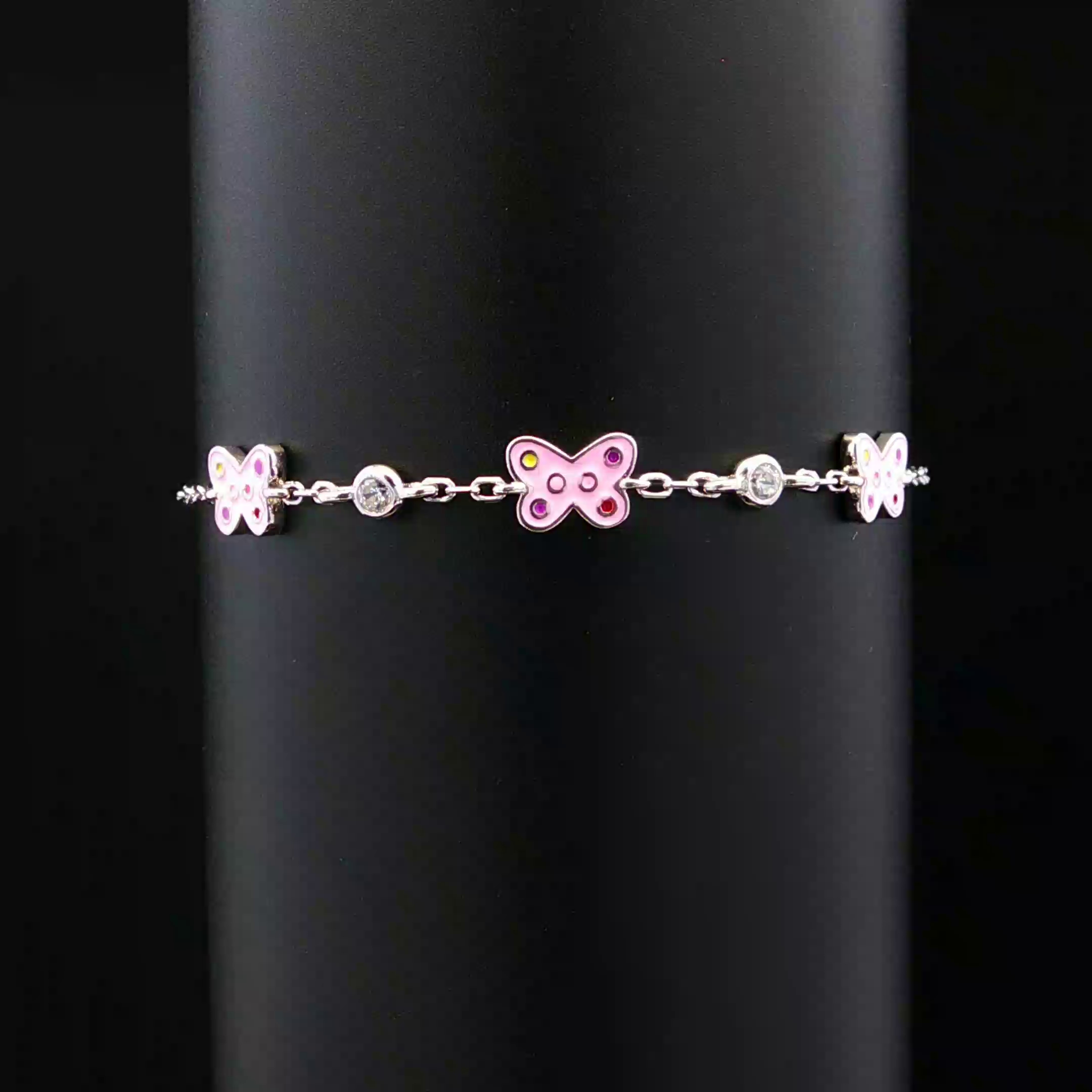 Deze schattige kinderarmband is gemaakt van gerhodineerd zilver en versierd met drie roze vlinders in een speels ontwerp. De vlinders zijn afgewerkt met kleurrijke details in emaille en worden afgewisseld met fonkelende zirkonia steentjes. Een vrolijk sieraad dat elke outfit van je kleintje opvrolijkt.
