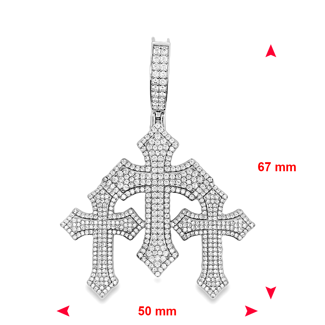 Deze zilveren hanger bestaat uit drie sierlijke kruizen die samen één krachtig geheel vormen. Volledig bezet met glinsterende zirkonia stenen zorgt dit ontwerp voor een opvallende en luxueuze uitstraling. De compositie symboliseert verbinding en evenwicht, en draagt een betekenisvolle lading in een uitgesproken stijl. Een sieraad dat zowel visueel als symbolisch indruk maakt.