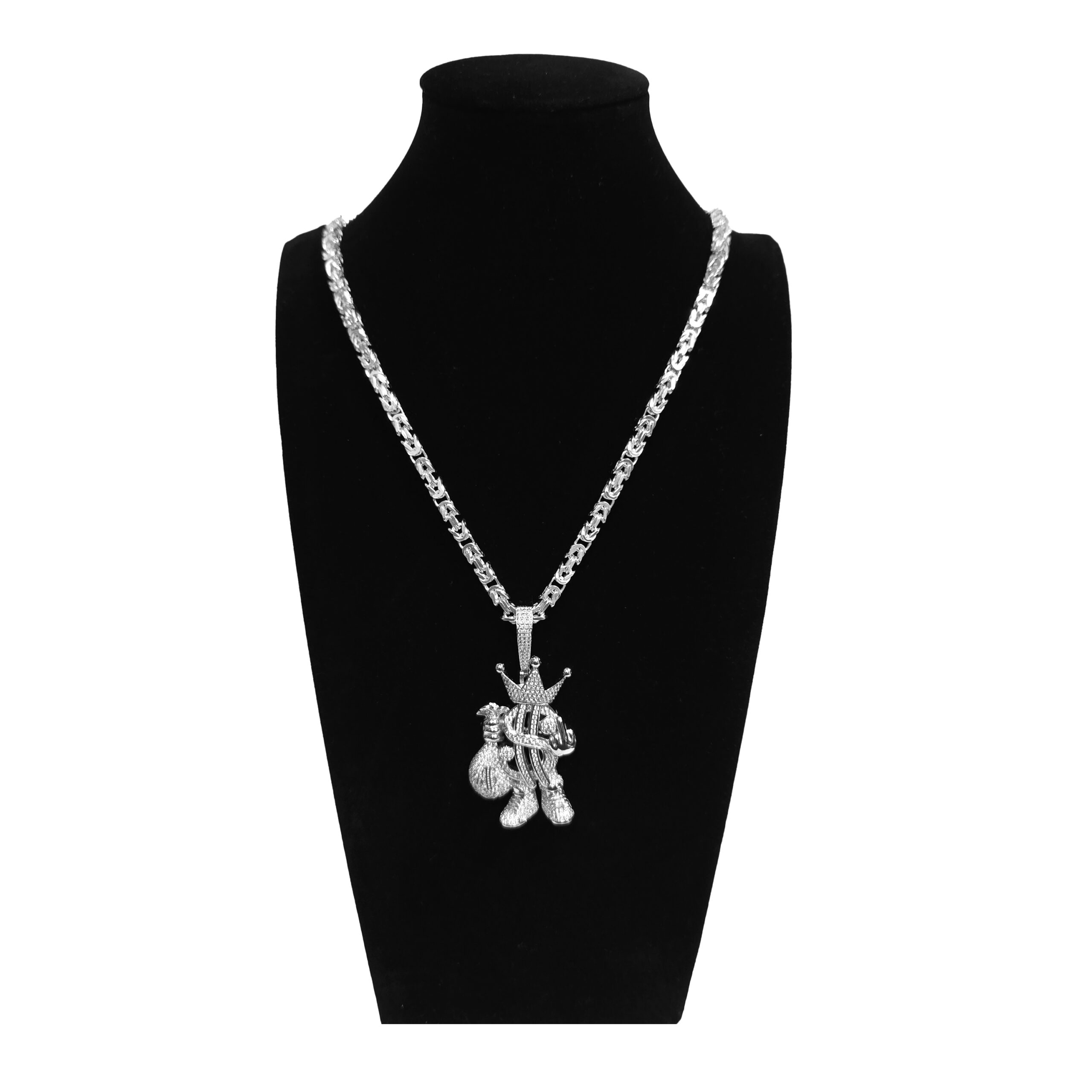 Deze zilveren gerhodineerde hanger in de vorm van een dollar figuur met een geldzak in zijn handen is een echte eyecatcher. Bezet met fonkelende zirkonia stenen straalt het luxe en stijl uit. Het opvallende ontwerp is geïnspireerd op de hiphop cultuur en perfect voor wie graag een statement maakt. Een uniek en speels sieraad dat iedere outfit extra flair geeft.