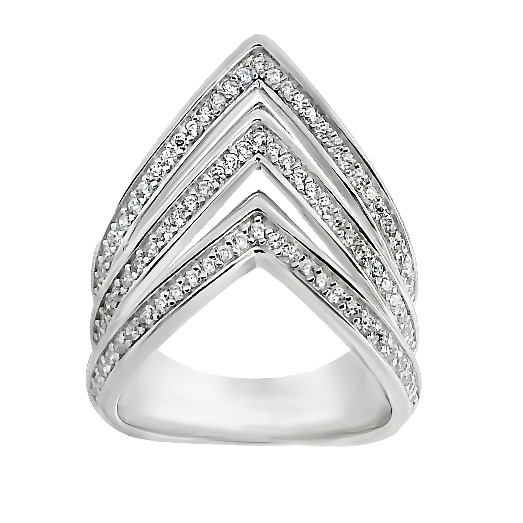 Zilveren gerhodineerde damesring met een modern en opvallend ontwerp. De ring bestaat uit driehoekige lagen die trapsgewijs over elkaar lopen en zijn gezet met sprankelende zirkonia stenen. Dit geeft het sieraad een speelse en dynamische uitstraling die zich onderscheidt van klassieke ringen. Een ring die perfect past bij wie graag net even iets unieks draagt en houdt van een mix van elegantie en karakter.