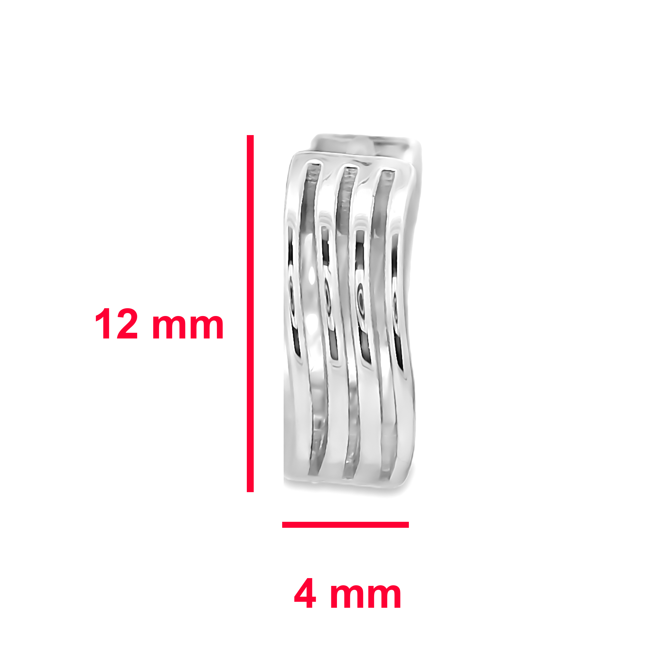 Deze gerhodineerde zilveren oorbellen hebben een strakke, golvende vorm met drie subtiele lijnen die het design extra diepte geven. De gladde afwerking geeft ze een moderne en nette uitstraling. Door de ronde, compacte vorm zitten ze prettig en vallen ze toch mooi op. Het golvende patroon zorgt voor een stijlvol detail zonder dat het te druk wordt. Een tijdloze keuze die gemakkelijk te combineren is met elke look.