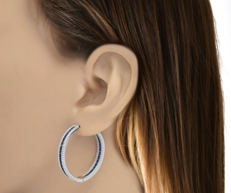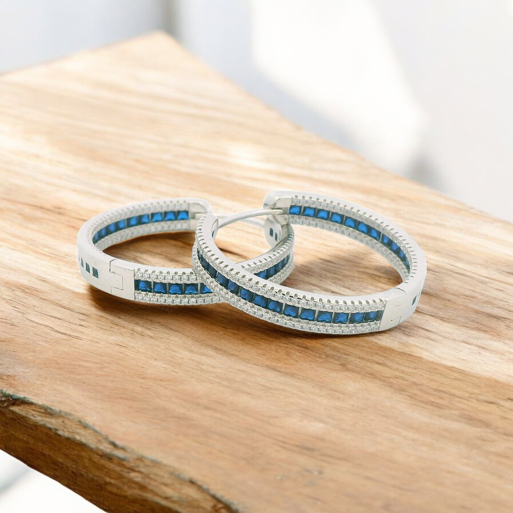 Zilveren gerhodineerde oorbellen met een rij blauwe zirkonia in het midden en heldere stenen aan de zijkanten stralen elegantie uit. De gerhodineerde laag beschermt het zilver langer tegen verkleuring en geeft een luxe glans. De combinatie van sprankelend blauw en helder wit maakt ze perfect voor elke gelegenheid. Of je nu een feestelijke look zoekt of subtiele dagelijkse glamour, deze oorbellen passen altijd.