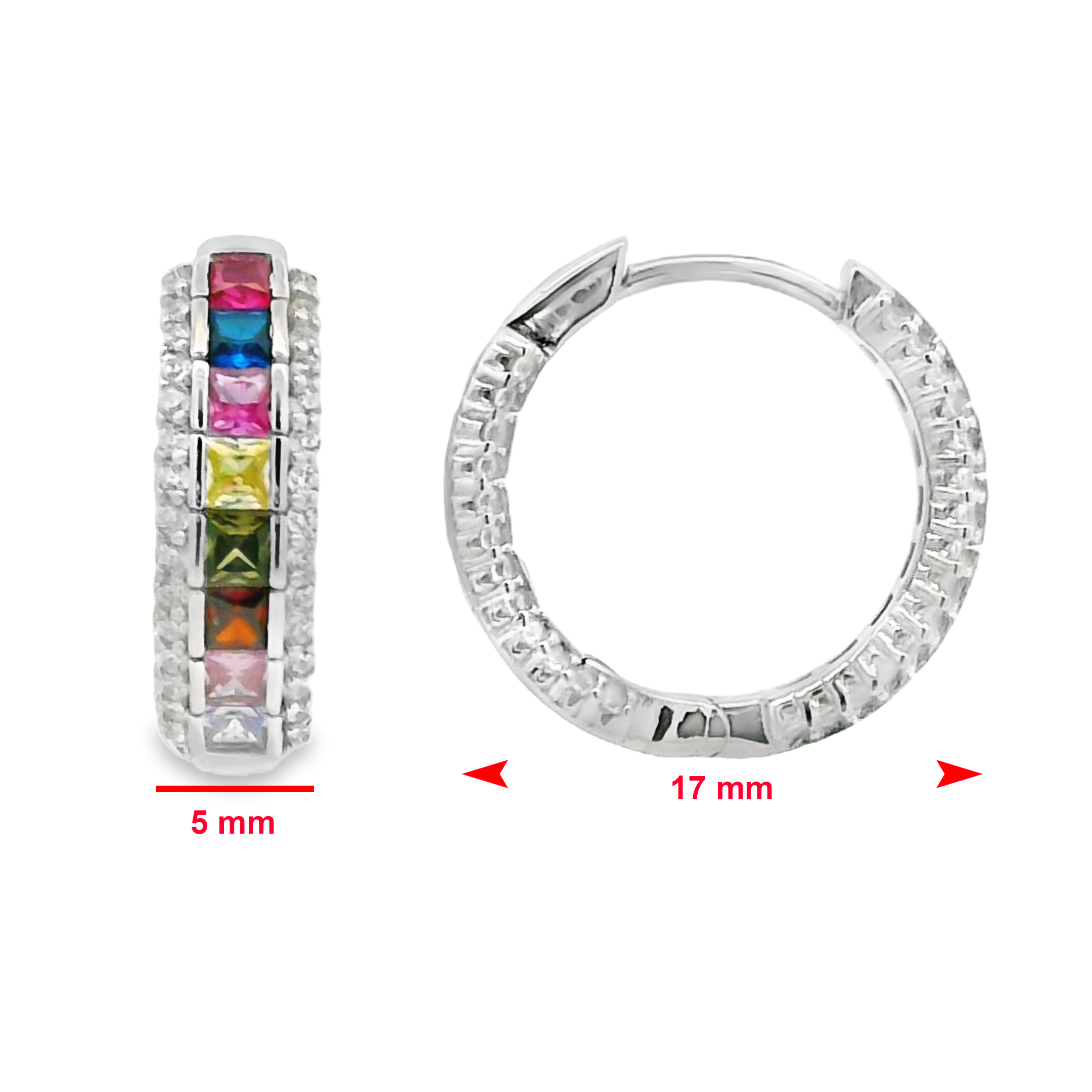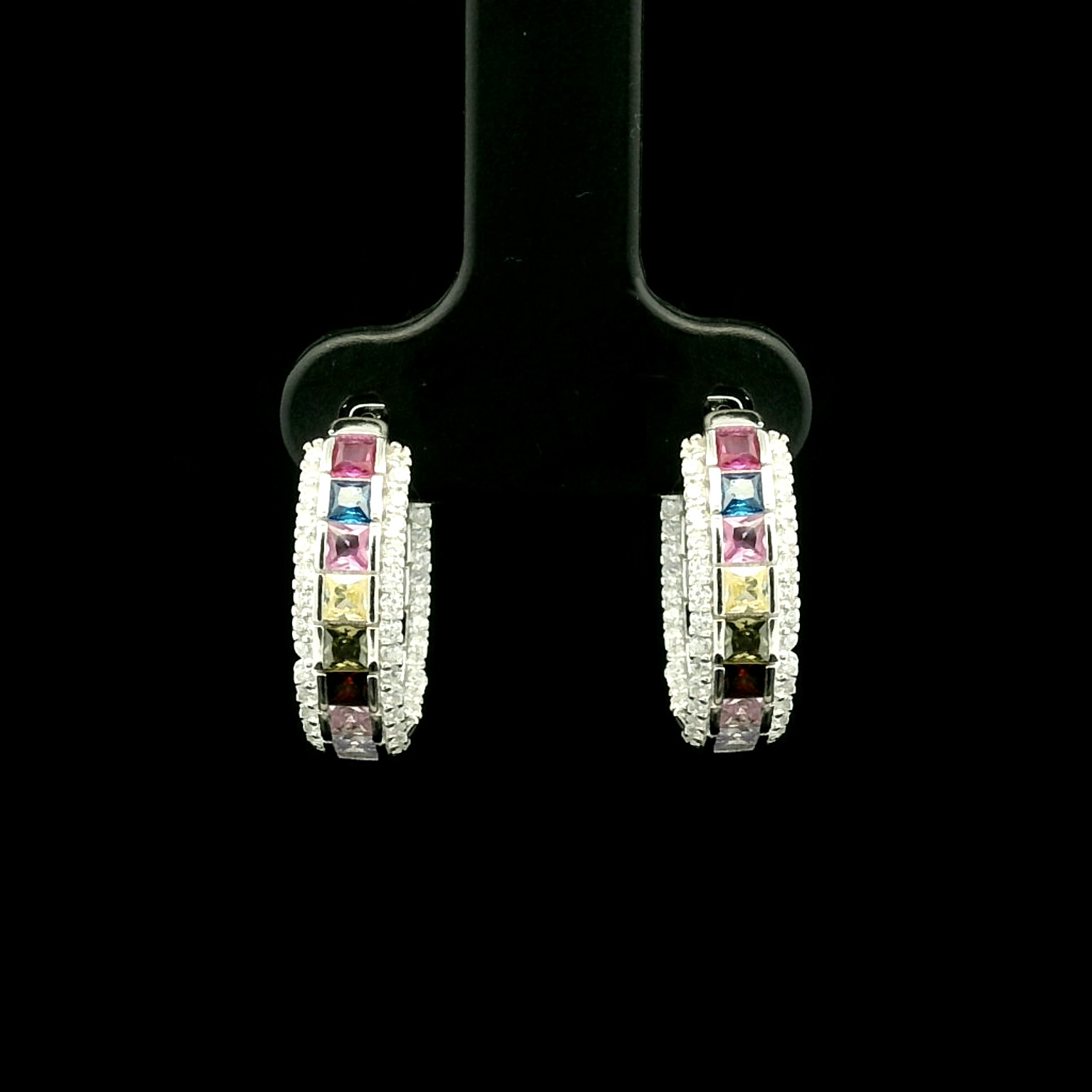 Deze zilveren oorbellen zijn een echte eyecatcher door de kleurrijke rij princess geslepen zirkonia stenen in het midden. De regenboogkleuren worden omlijst door een subtiel pavé van witte zirkonia’s, wat zorgt voor extra schittering. De oorbellen zijn gerhodineerd voor een mooie glans en passen perfect bij een speelse en moderne stijl.