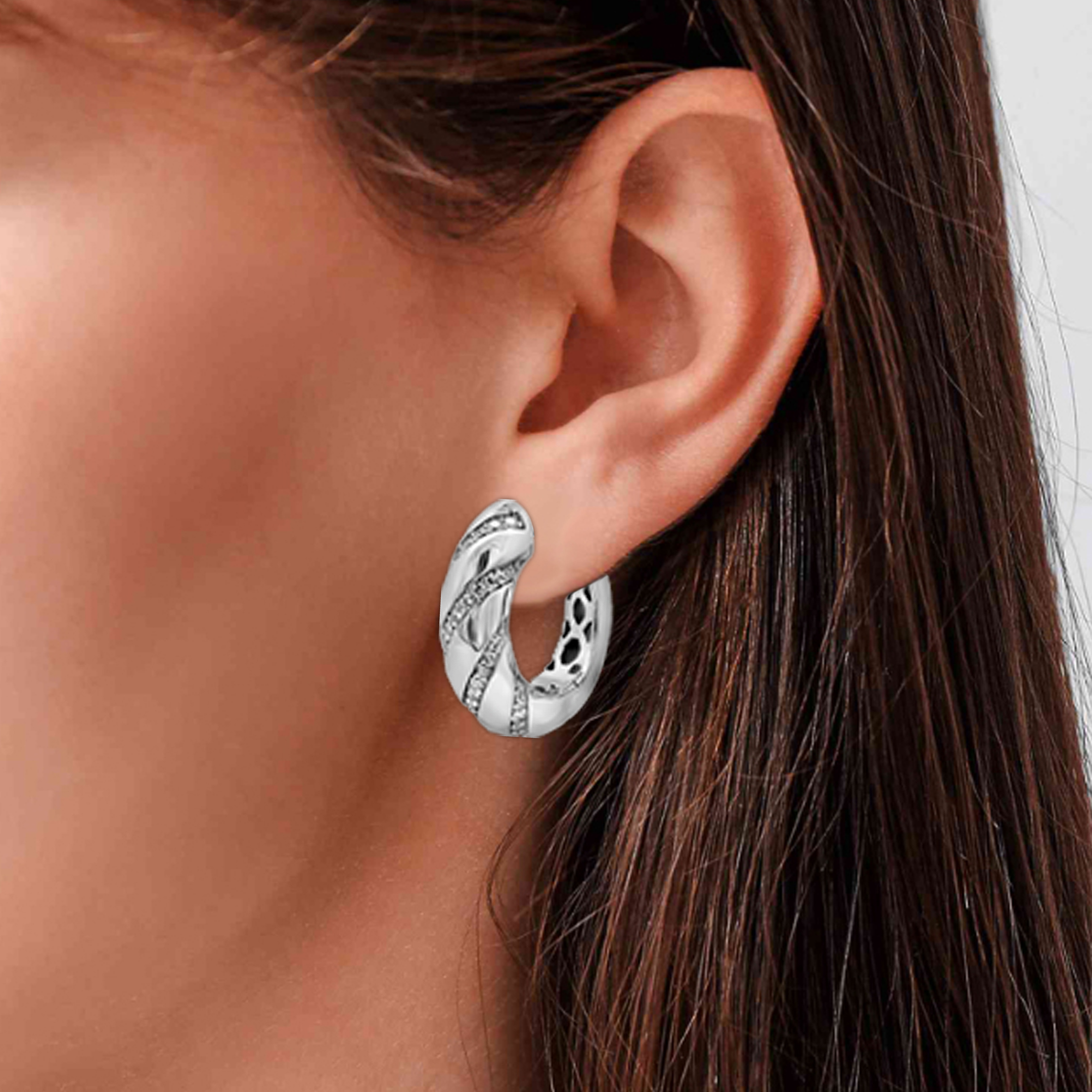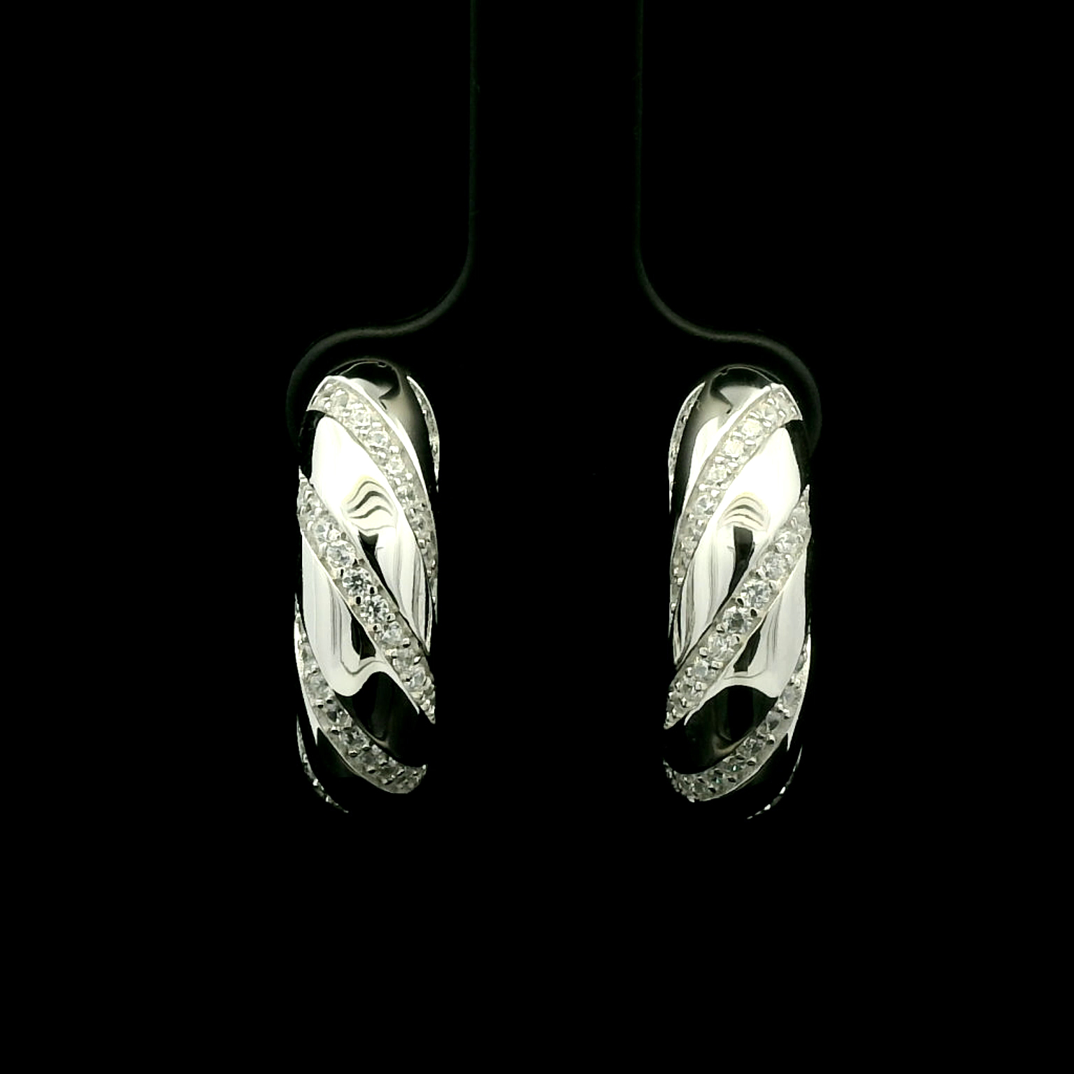 Deze zilveren oorbellen hebben een stijlvol gedraaid ontwerp waarin glanzend gepolijste banen worden afgewisseld met pavé gezette zirkonia’s. De elegante, speelse draai geeft de oorbellen een luxe uitstraling die perfect combineert met zowel een casual als chique outfit. Dankzij de gerhodineerde afwerking blijven ze langer prachtig glanzen.