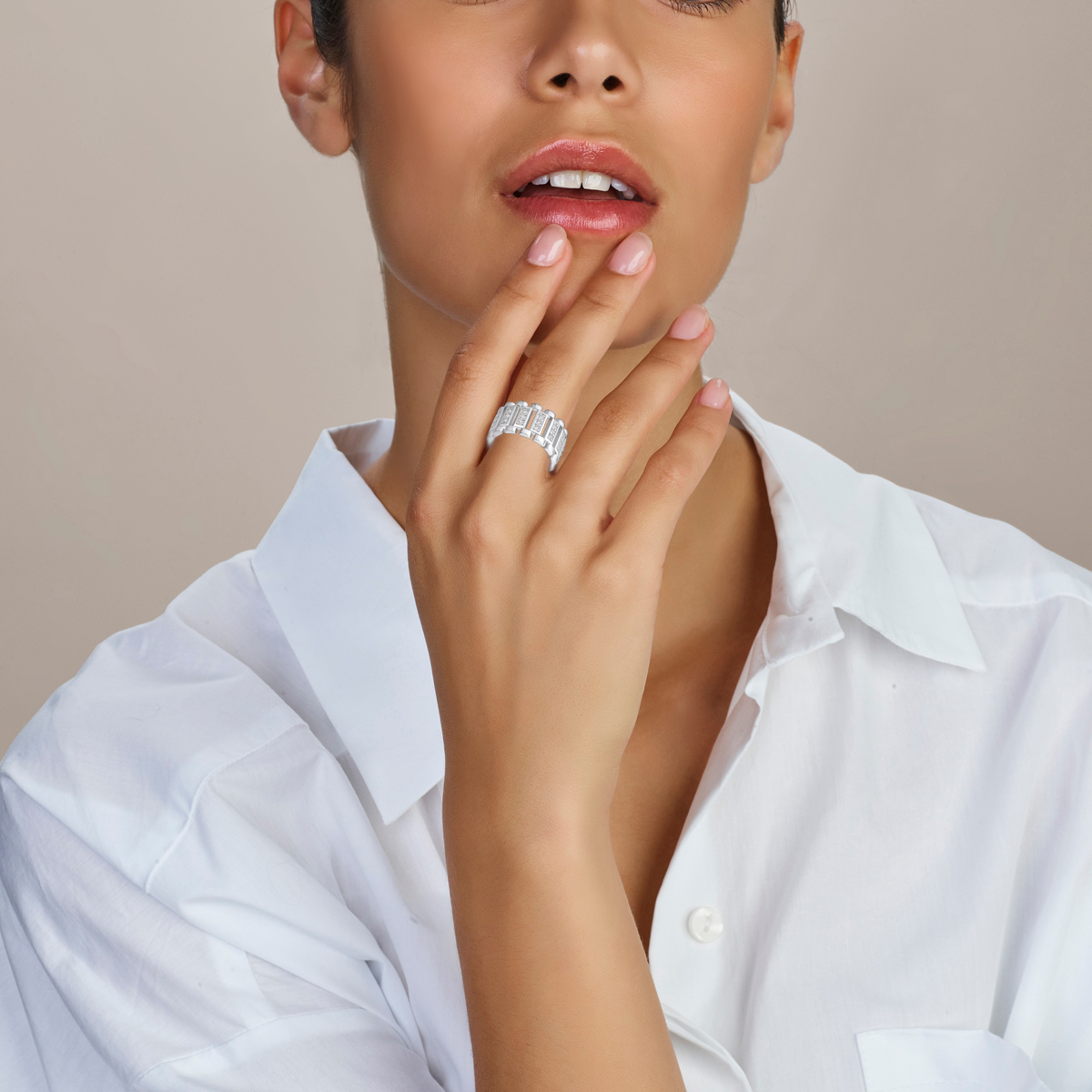 Deze zilveren ring heeft een stoer en modern ontwerp dat direct in het oog springt. De brede band is voorzien van rechthoekige vlakken met fonkelende zirkonia’s, wat zorgt voor een luxe en stijlvolle uitstraling. Het speelse patroon en de glanzende afwerking maken deze ring uniek en eigentijds. Perfect voor wie houdt van een statement sieraad dat klasse en karakter uitstraalt.