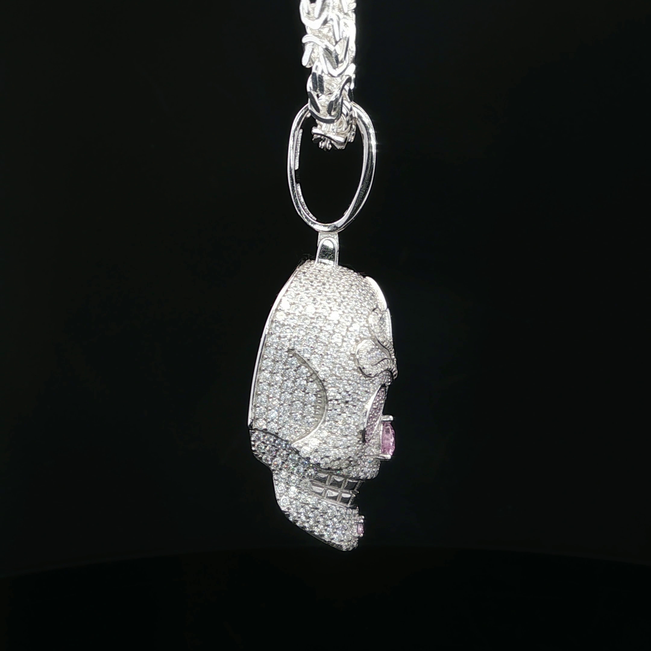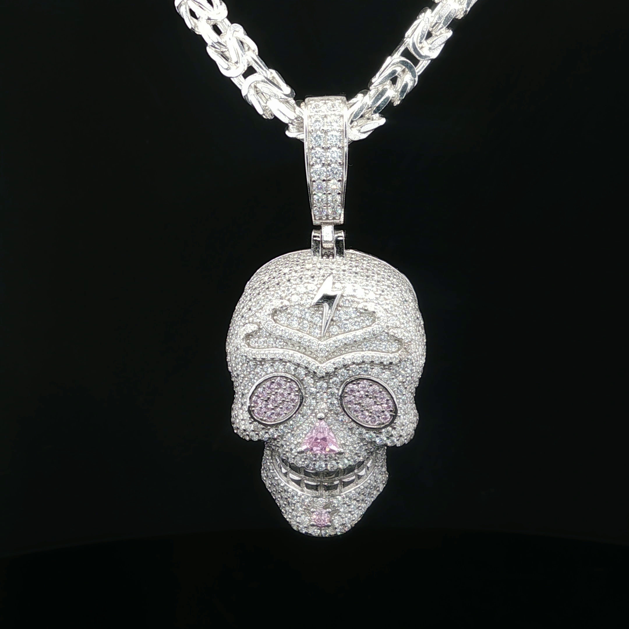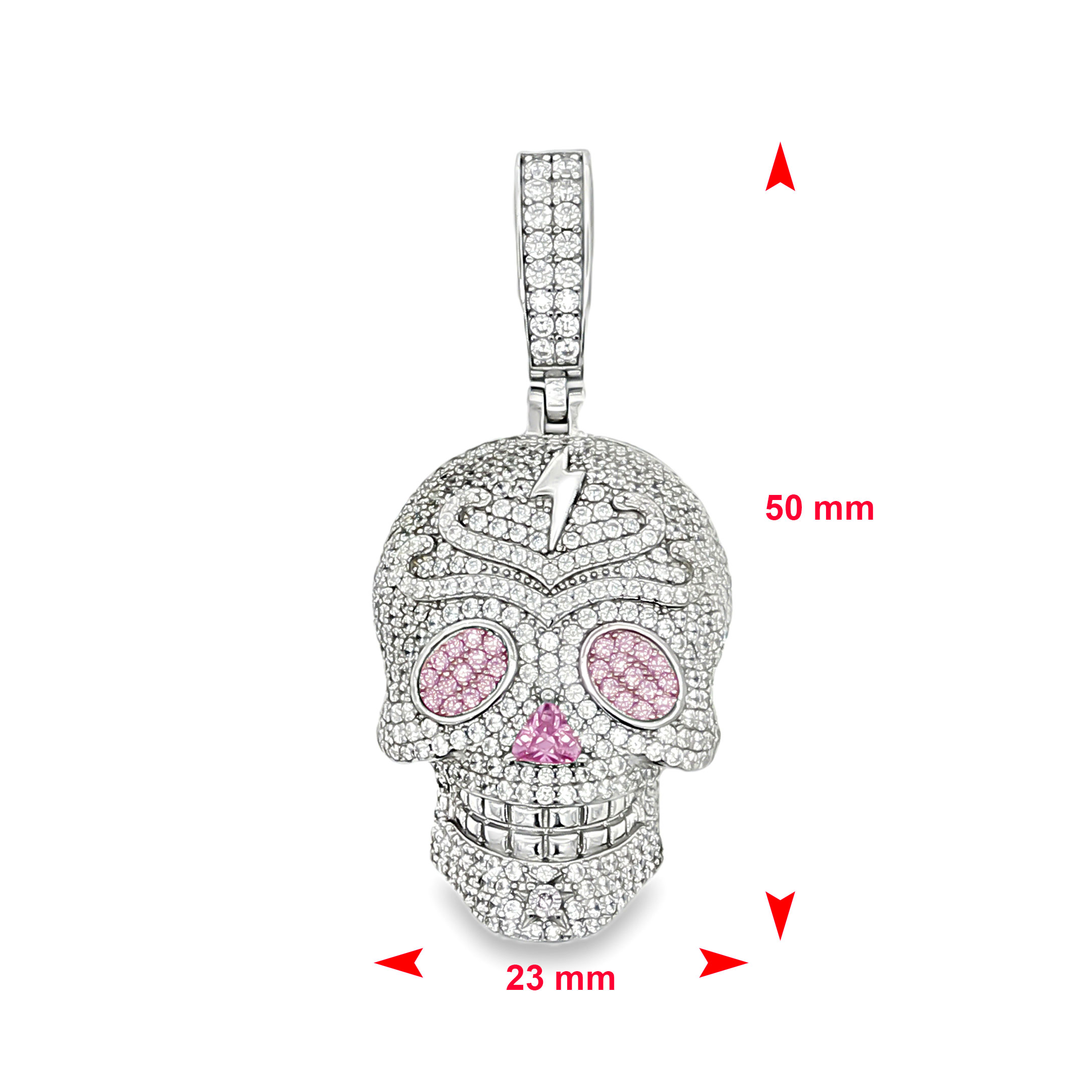 Deze zilveren gerhodineerde hanger in de vorm van een schedel is volledig bezet met zirkonia stenen en heeft een opvallend luxe ontwerp. De roze zirkonia ogen en de bijpassende neus zorgen voor een speels maar krachtig contrast met de heldere stenen. Op het voorhoofd is een bliksemsymbool verwerkt, wat het ontwerp extra karakter geeft. Door het uitgesproken design is dit sieraad een echte eyecatcher. Geschikt om solo te dragen of te combineren met andere kettingen.