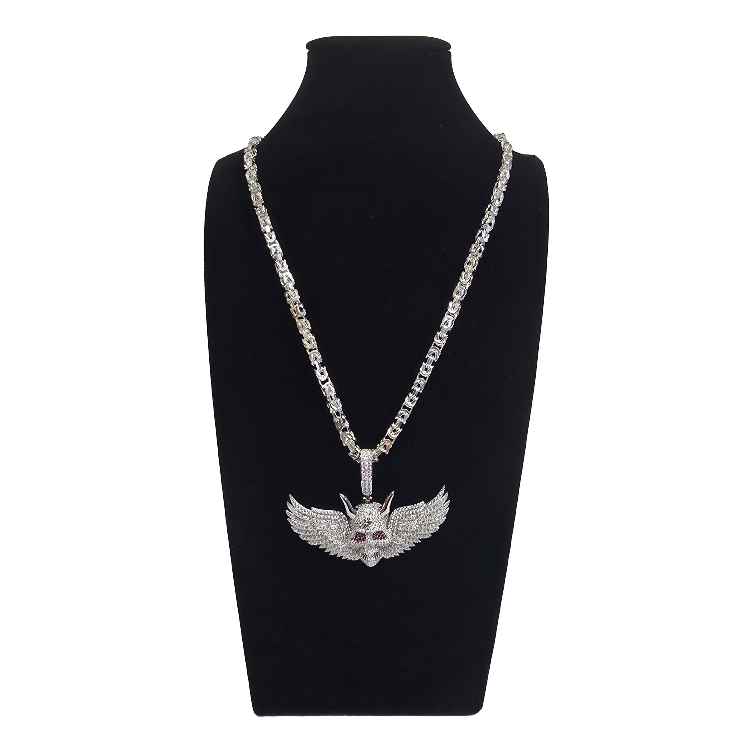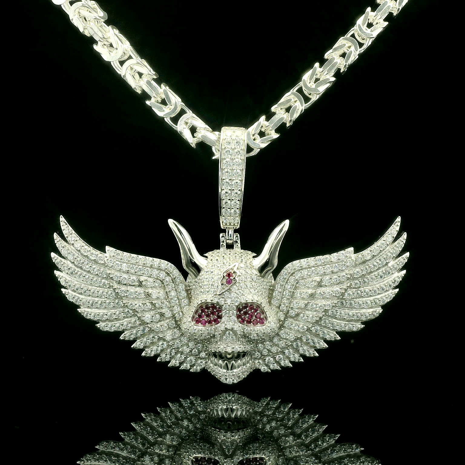 Zilveren hanger in de vorm van een gevleugelde schedel met hoorns, volledig bezet met fonkelende zirkonia stenen en rode accenten in de ogen en neus. De hanger is gerhodineerd en heeft een krachtig en gedetailleerd design. De uitgespreide vleugels en het opvallende schedelmotief geven dit sieraad een stoere en unieke uitstraling, perfect als statement piece binnen elke sieraden collectie.
