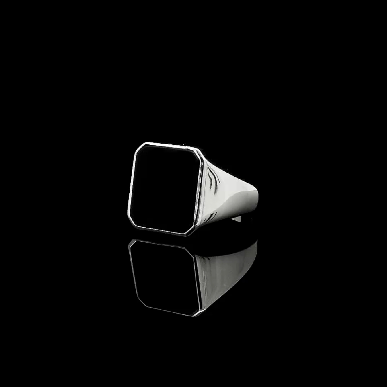 Deze zilveren gerhodineerde zegelring heeft een stoere, rechthoekige achthoek vorm die direct opvalt. De rhodiumlaag zorgt voor een langdurige glans. In het midden ligt een diepzwarte onyx steen, die de ring een krachtige en verfijnde uitstraling geeft. Een perfect sieraad voor wie modern design en tijdloze klasse wil combineren.