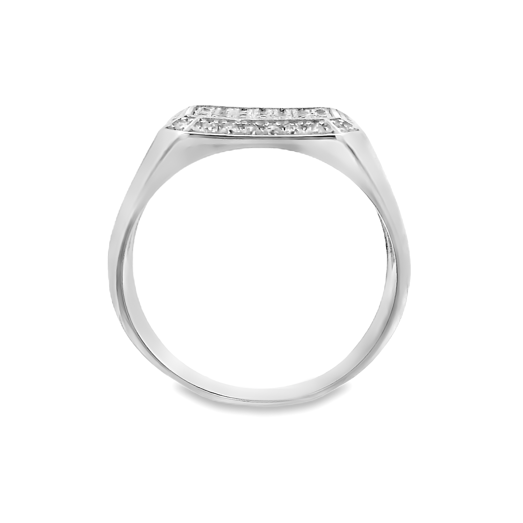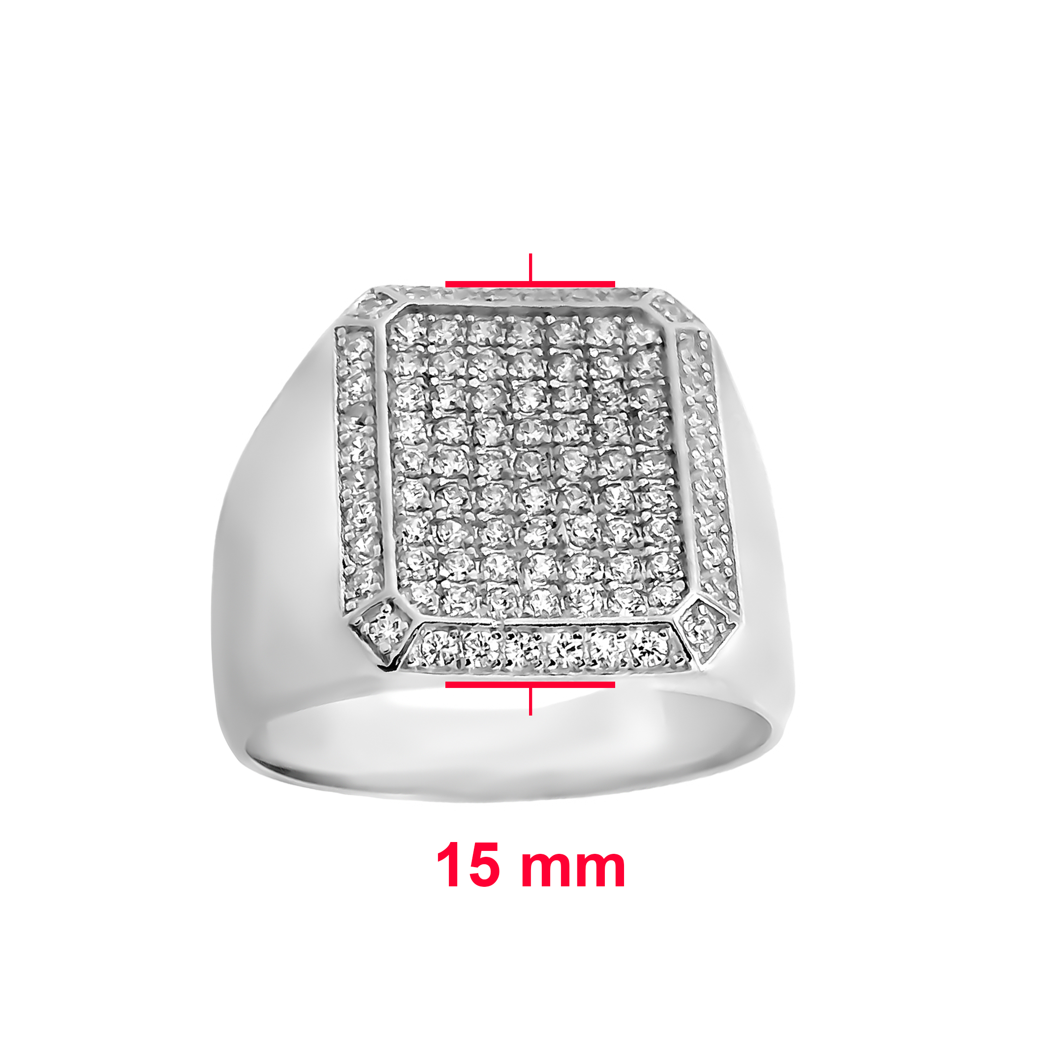 Zilveren gerhodineerde ring met een krachtig en opvallend design. De brede bovenplaat heeft een rechthoekige vorm en is volledig gezet met meerdere rijen fonkelende zirkonia stenen. De strakke lijnen en het geometrische patroon geven de ring een moderne en luxe uitstraling. Een statement ring die perfect is voor wie graag een stijlvol en zelfverzekerd accent toevoegt aan zijn look.